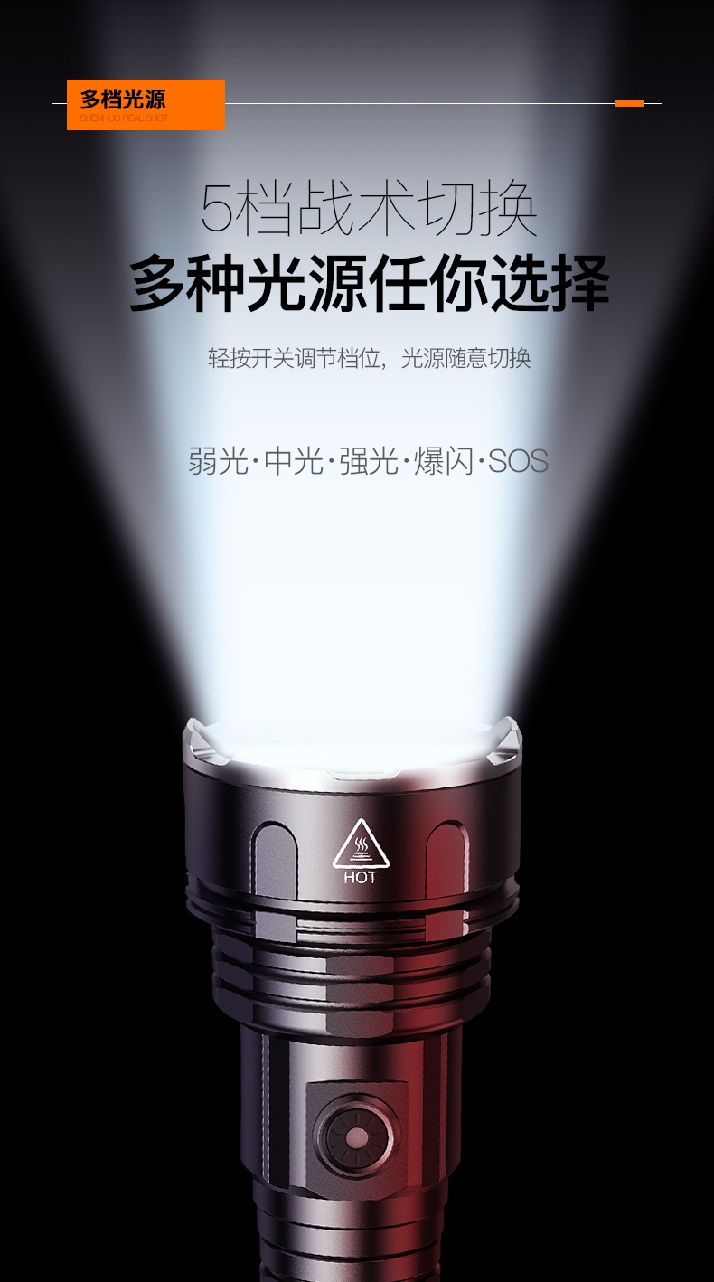 1、多档调光,可满足不同使用场景下的照明需求; 2、含提手,握感更舒适。携带更简单; 3、新型高亮远射灯珠,60W大功率,亮度高,照明效果好。