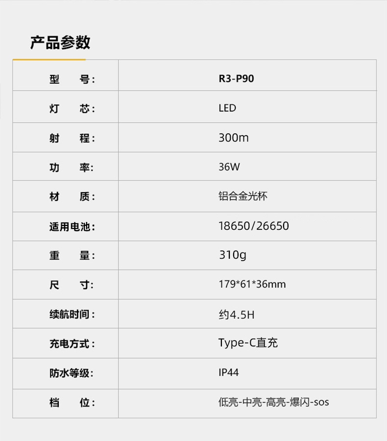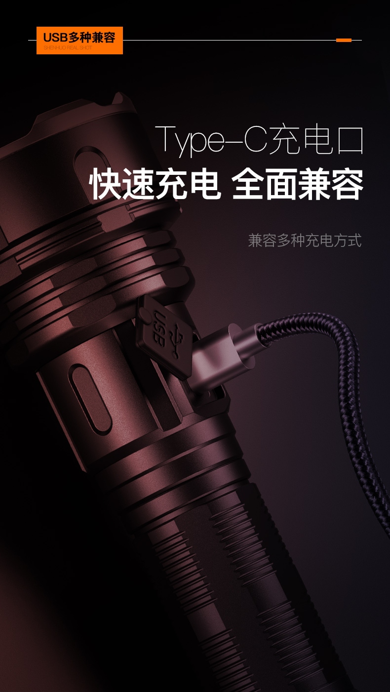 四档调光 Type-C充电 电量显示 铝合金筒身 持久续航 强力防水