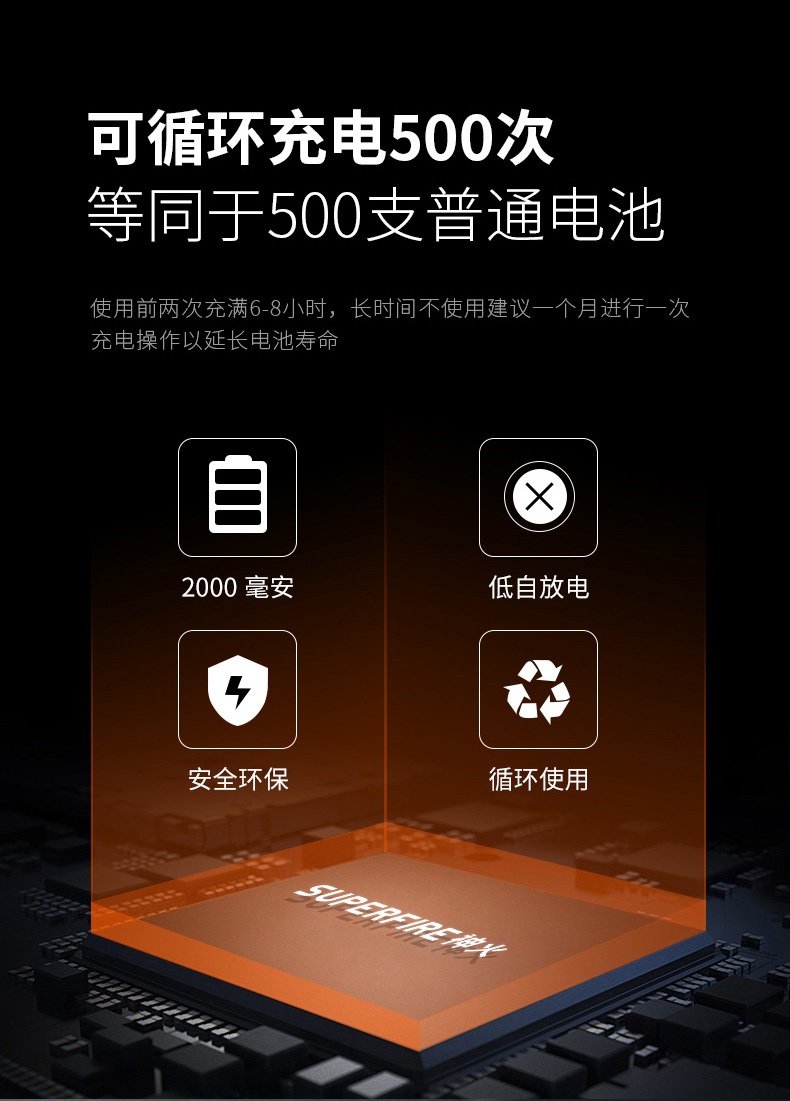 1、千米远射,射程更远,光斑更聚焦。 2、进口灯珠,亮度高,照明效果更好。 3、前后双按键,光源一键点亮,高亮瞬间开启。