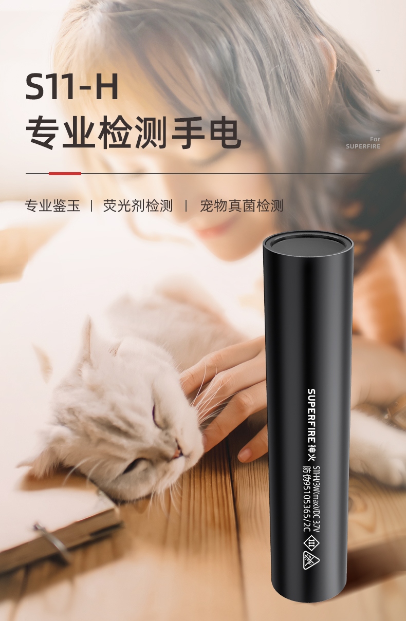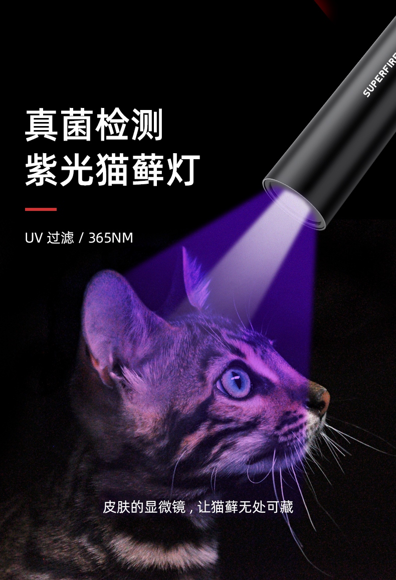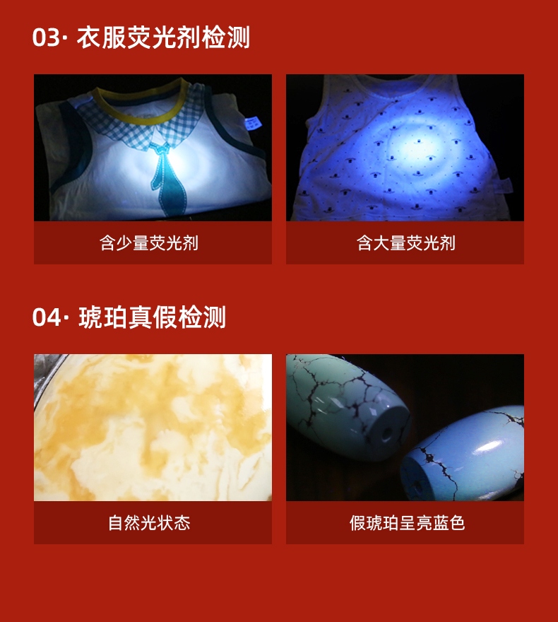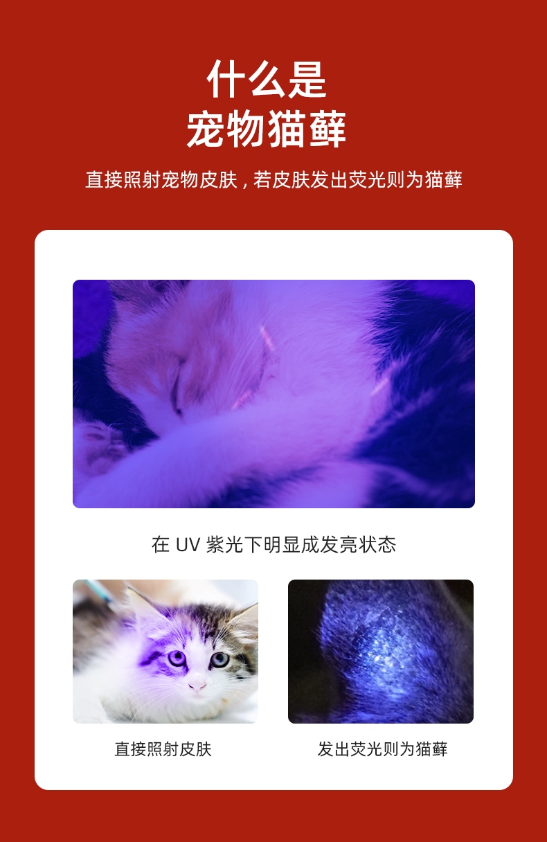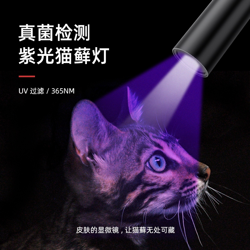 此款365紫外线灯,紫光验真伪,检测荧光剂,采用黑镜可照宠物藓,宠物尿液,皮肤检测等. (注意:本款产品照在手上和桌子上显示微弱的白光,照在白纸上显示紫光)