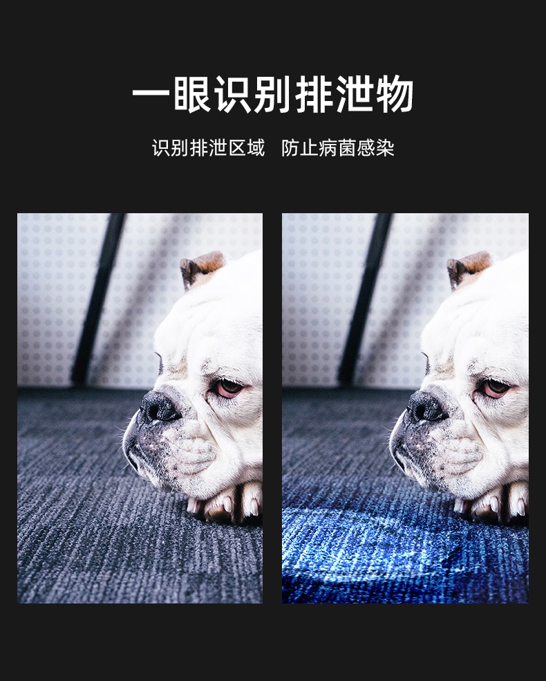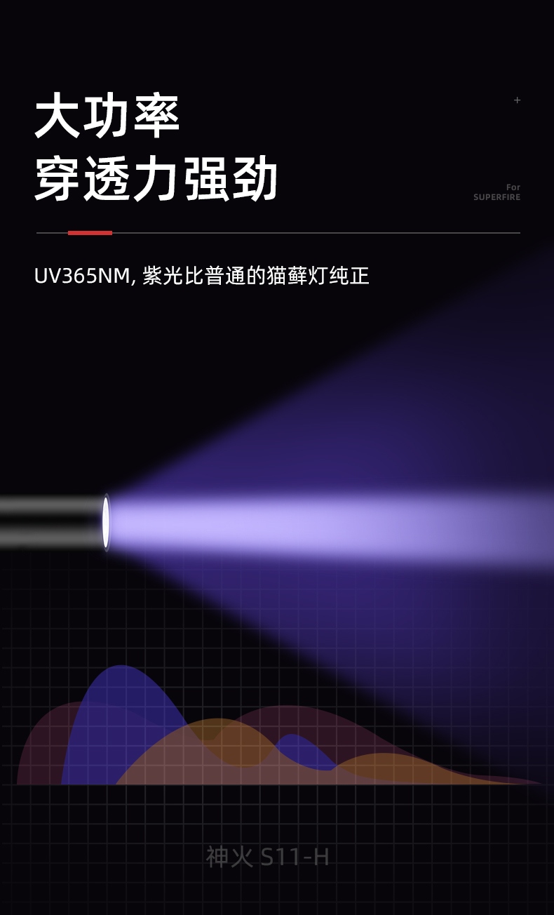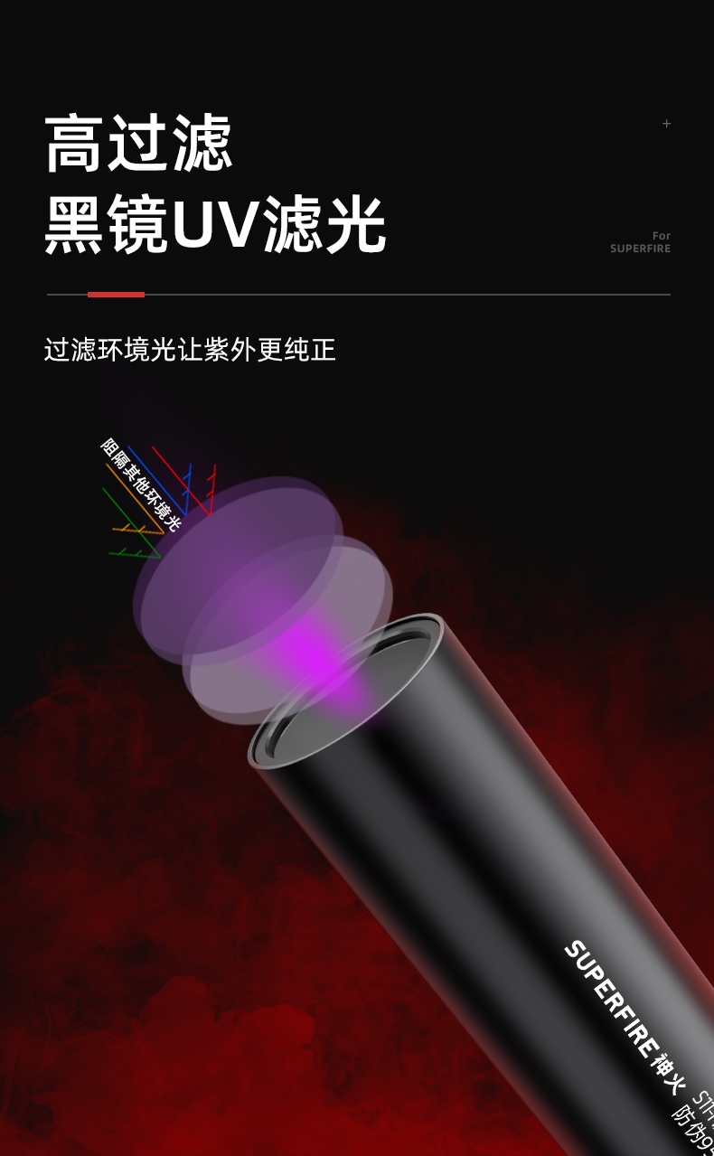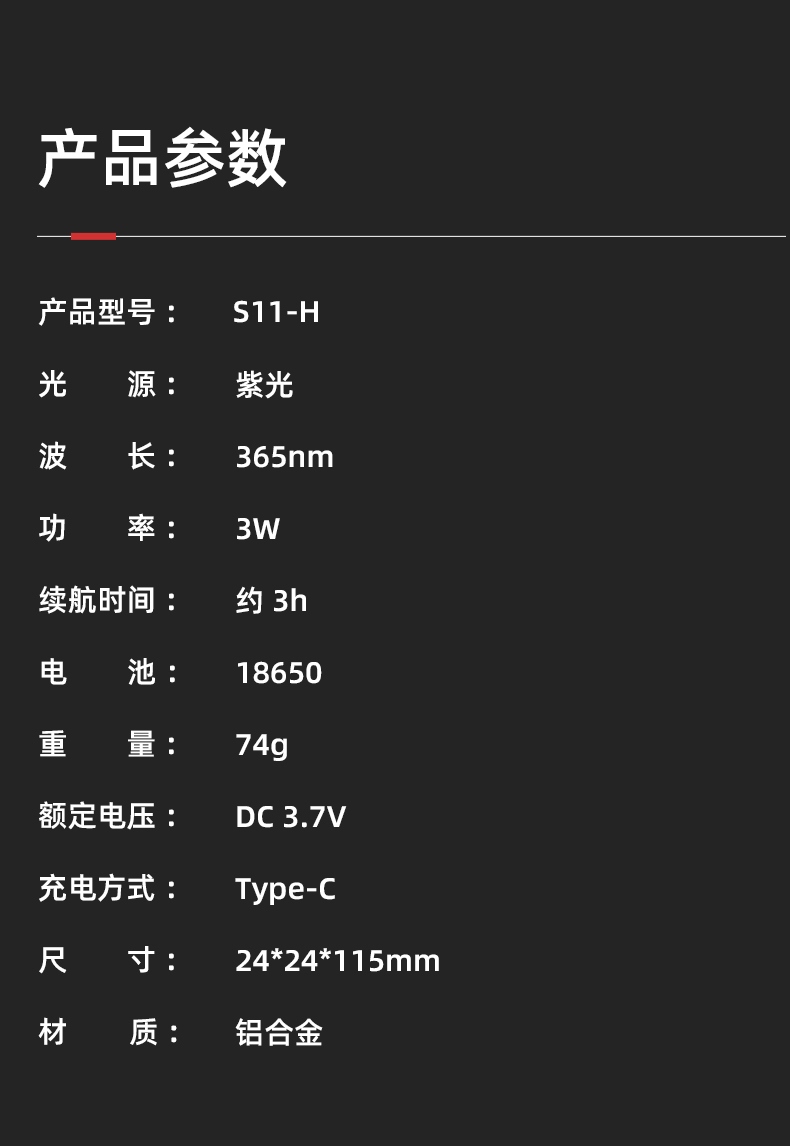 此款365紫外线灯,紫光验真伪,检测荧光剂,采用黑镜可照宠物藓,宠物尿液,皮肤检测等. (注意:本款产品照在手上和桌子上显示微弱的白光,照在白纸上显示紫光)