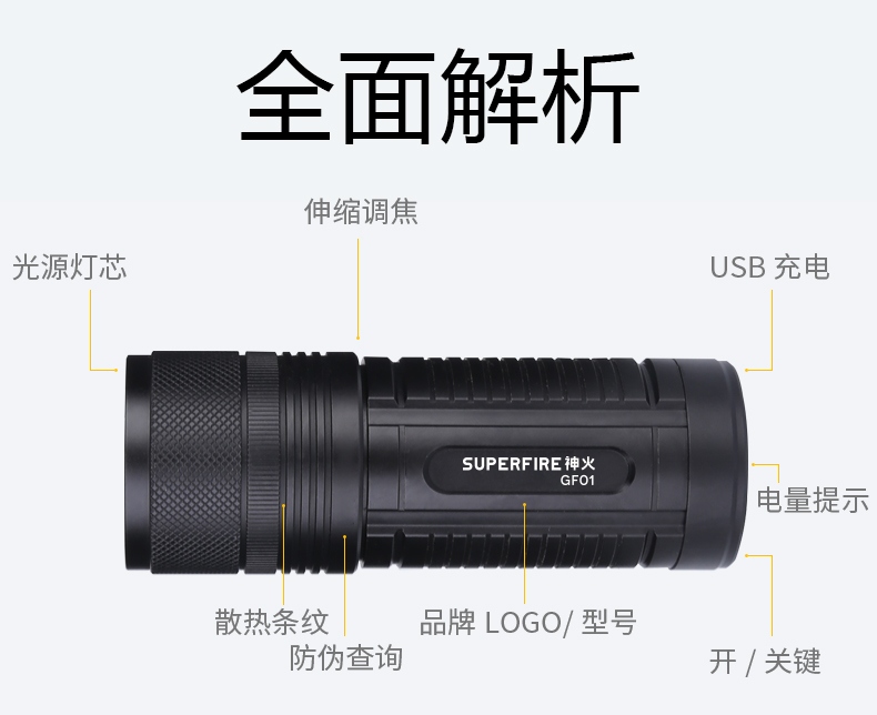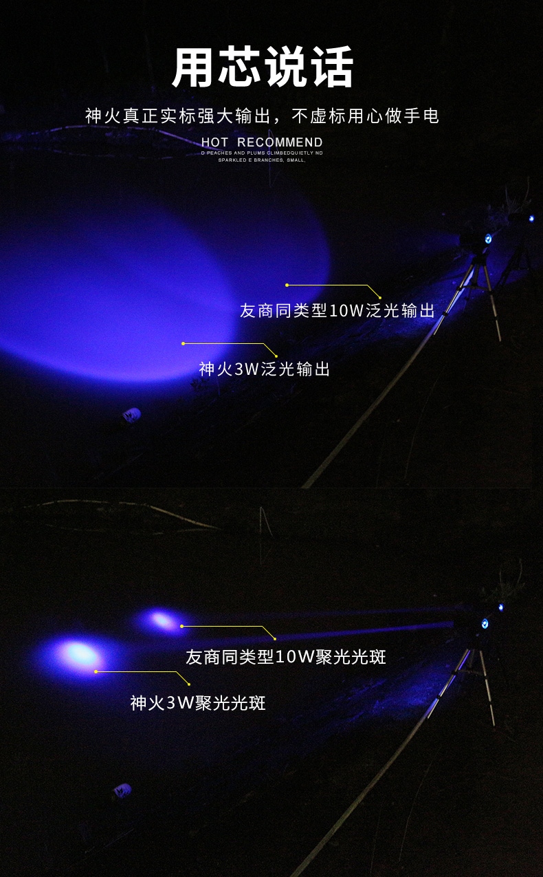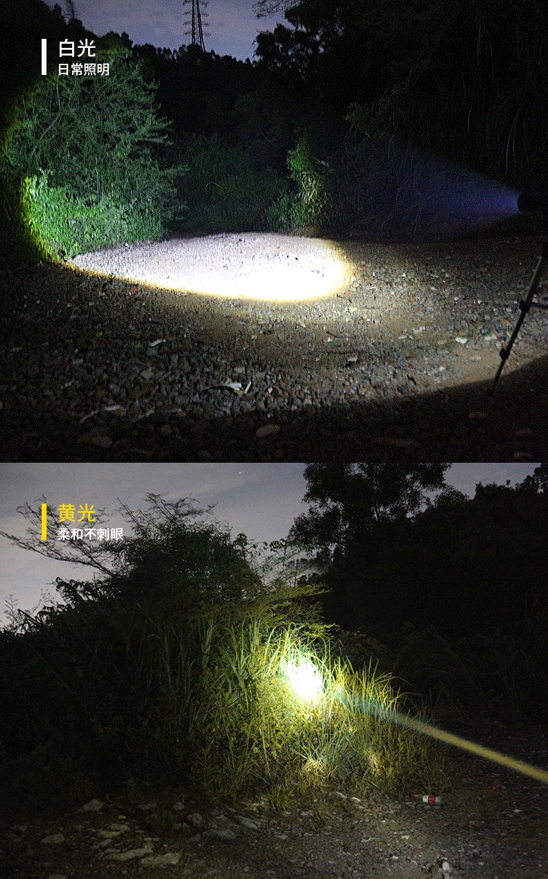 1、千米远射,射程更远,光斑更聚焦。 2、进口灯珠,亮度高,照明效果更好。 3、前后双按键,光源一键点亮,高亮瞬间开启。