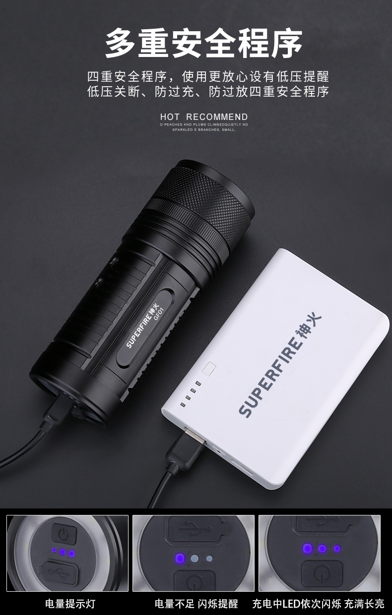 1.单击左边开关开启感应功能,同时开启强光档,续按关闭感应功能(关闭感应功能,光源不会关闭),当感应功能开启时,单击右边开关可正常调节档位。 2.多样化充电,使用方便:设有Type-c充电口,可使用充电器、充电宝、电脑等设备为灯具充电。 3.电量显示:实时