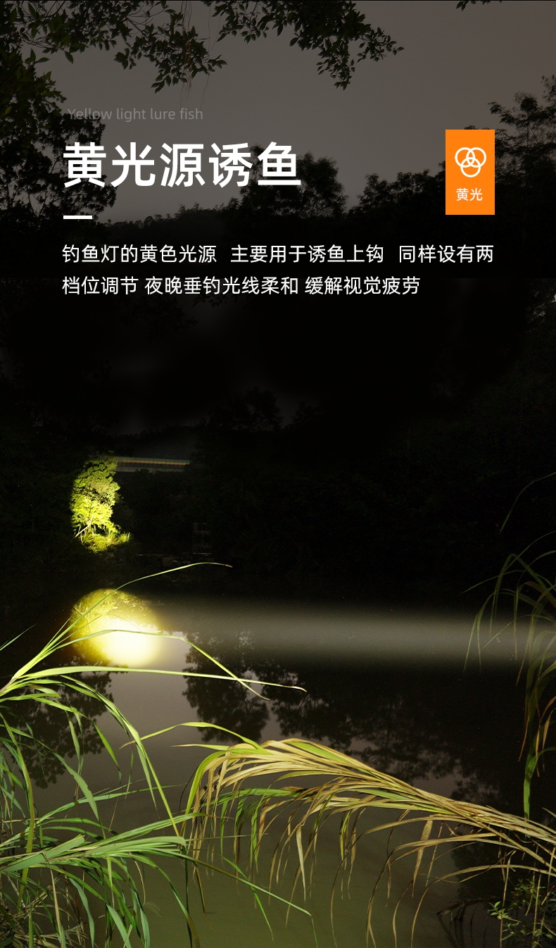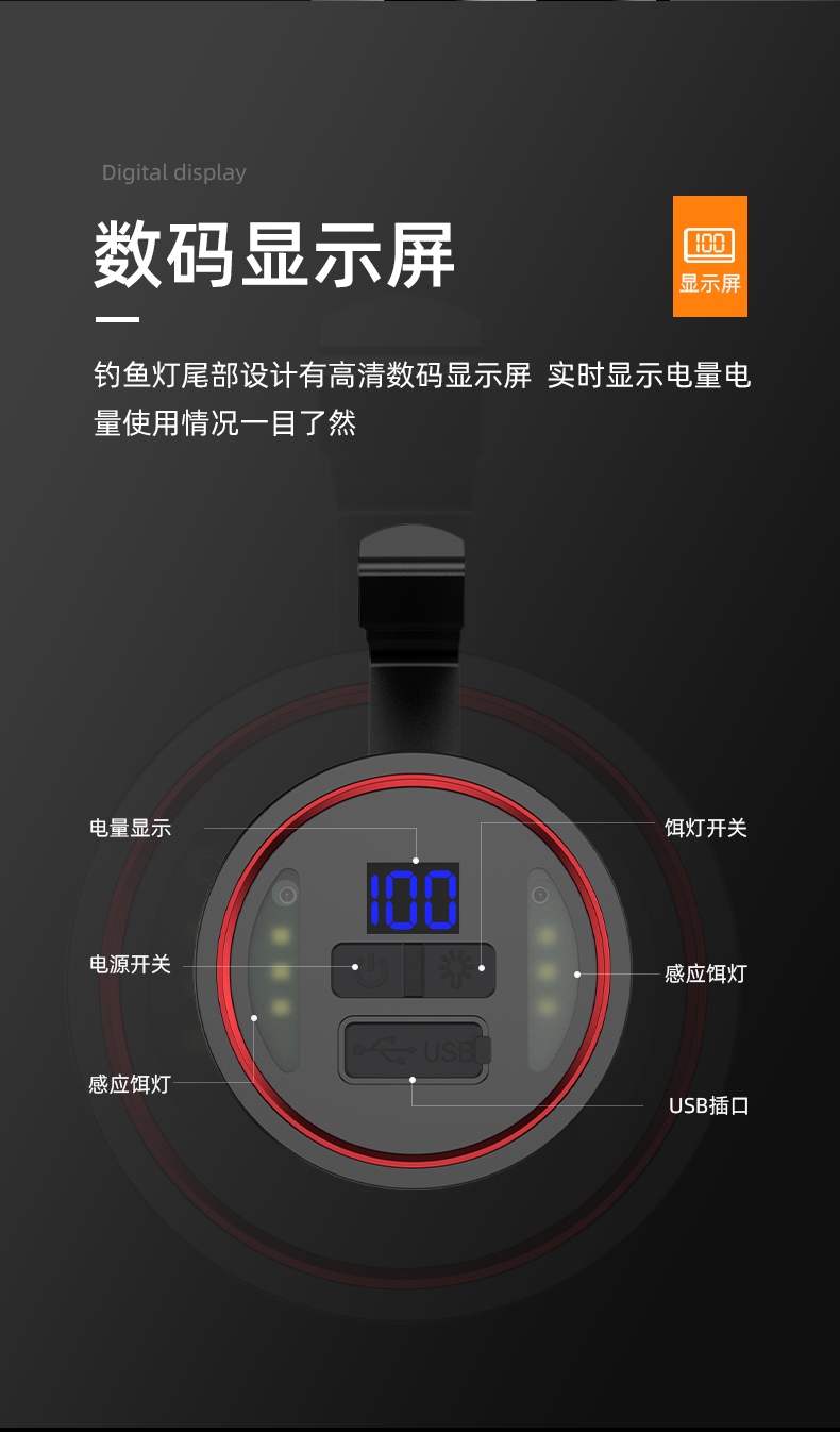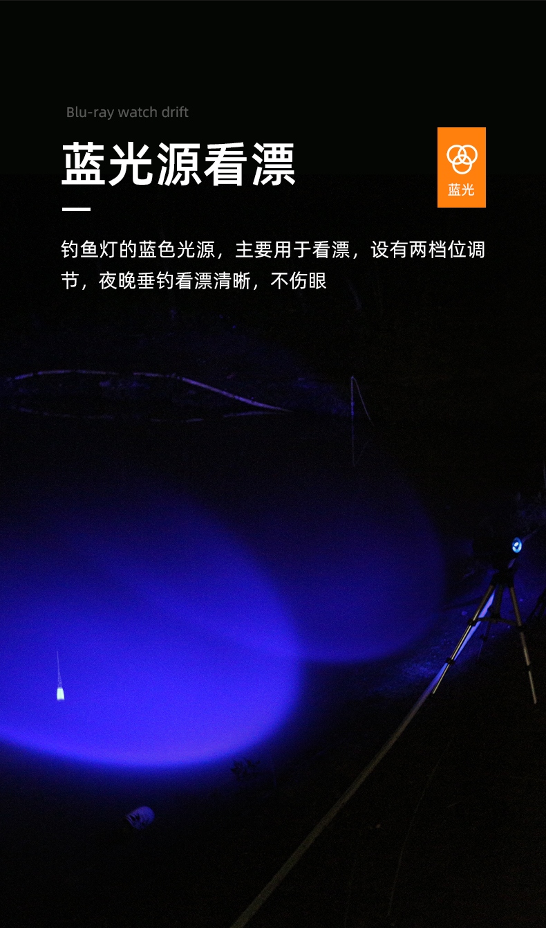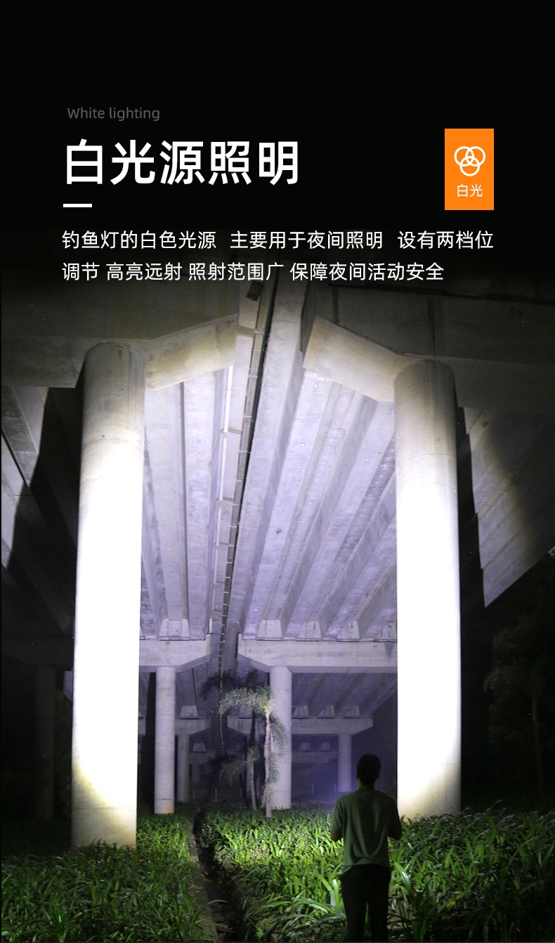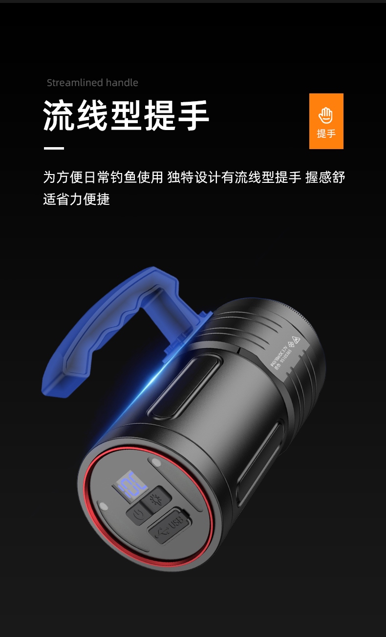专业钓鱼灯(3种光源:白光、黄光、蓝光),数显电量提示更直观