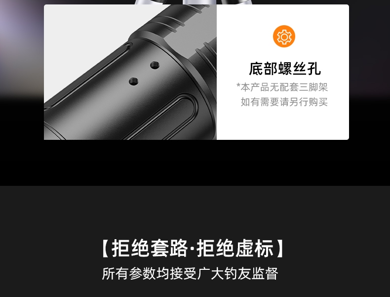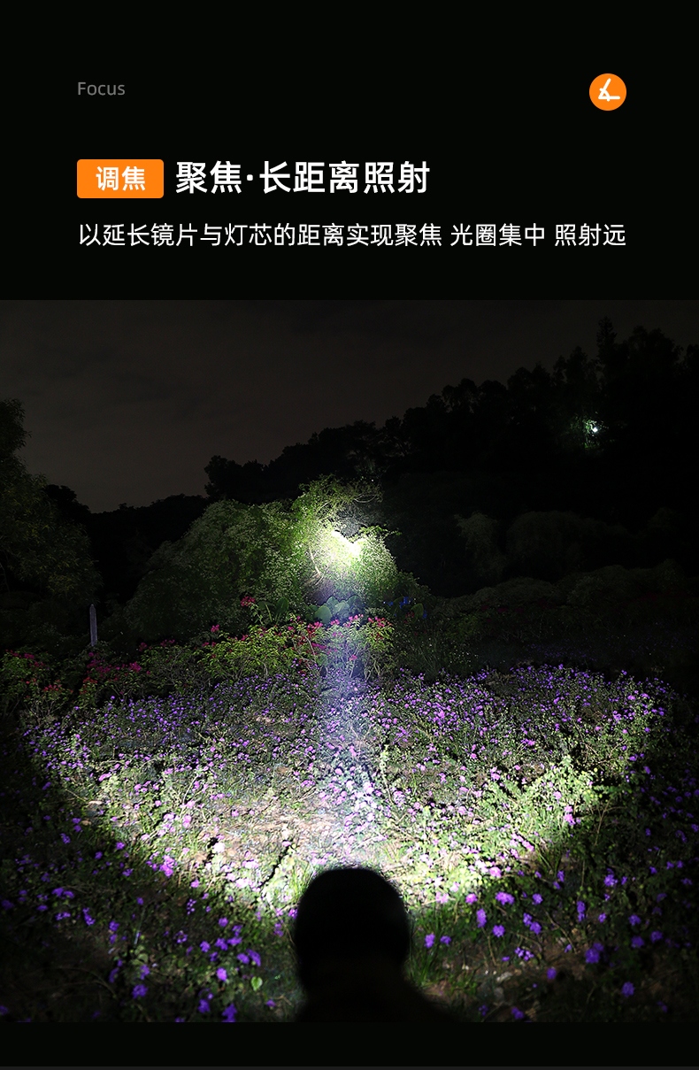 1、千米远射,射程更远,光斑更聚焦。 2、进口灯珠,亮度高,照明效果更好。 3、前后双按键,光源一键点亮,高亮瞬间开启。