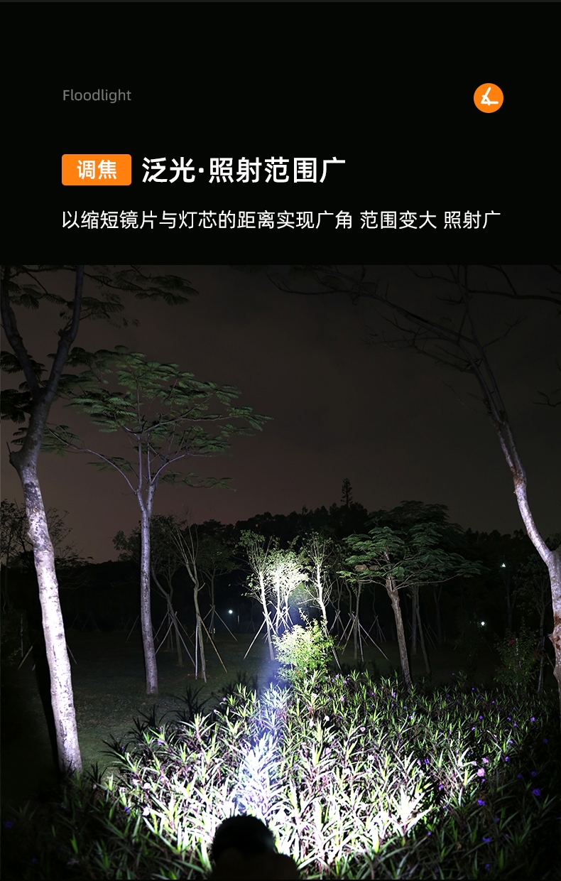 聚光主灯 亮度随心 轻按后端开关按钮,主灯强光点亮,续按依次切换主灯工作光-爆闪光。主灯开启状态下长按5秒,可实现光源色温转换。主灯关闭状态下长按5秒,可开启灯具最亮照明模式。 爆亮强光 亮如白昼 1500LM大功率高亮光源,点亮顷刻如白昼