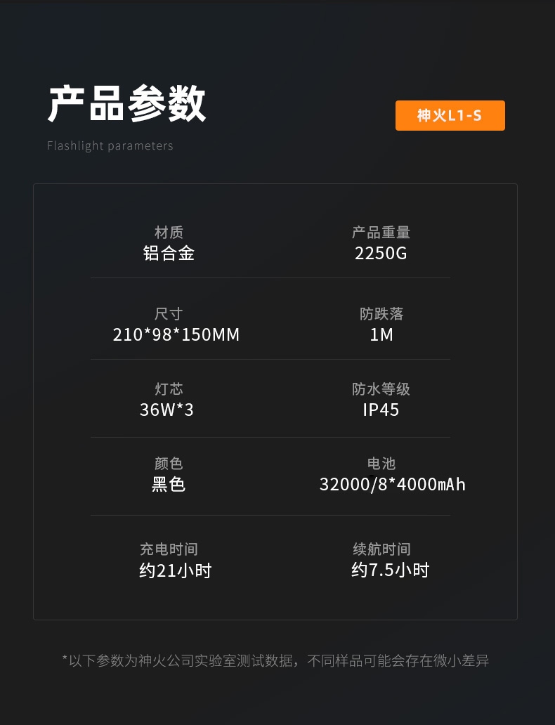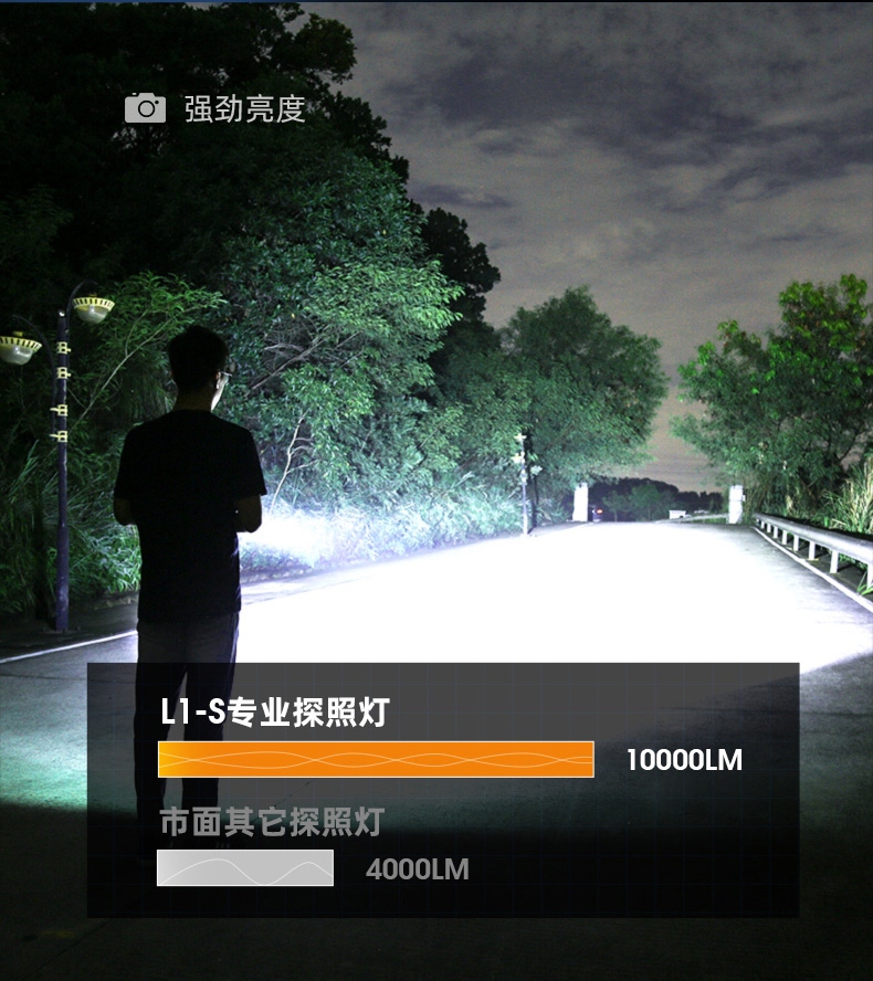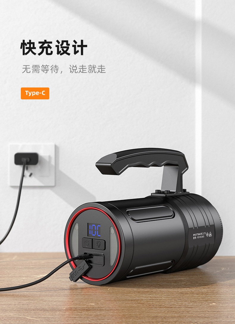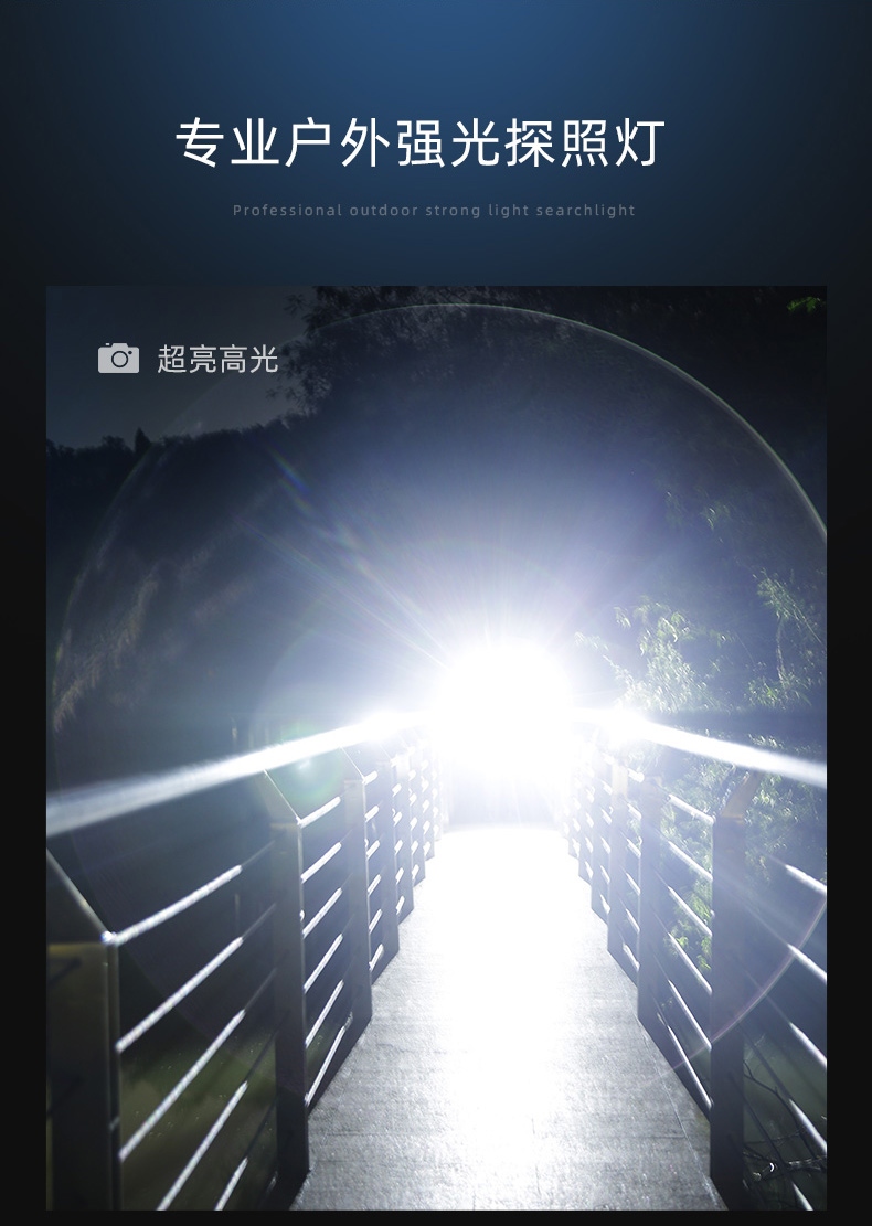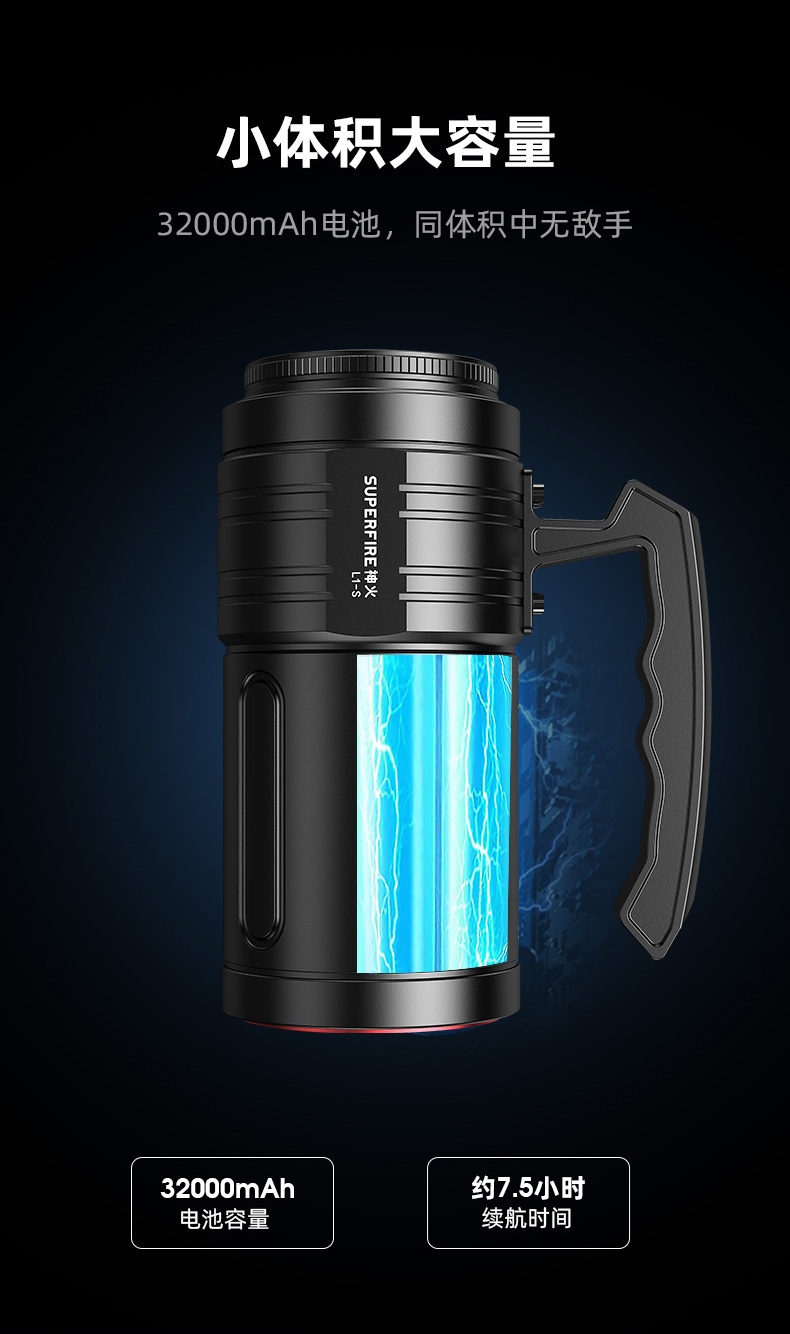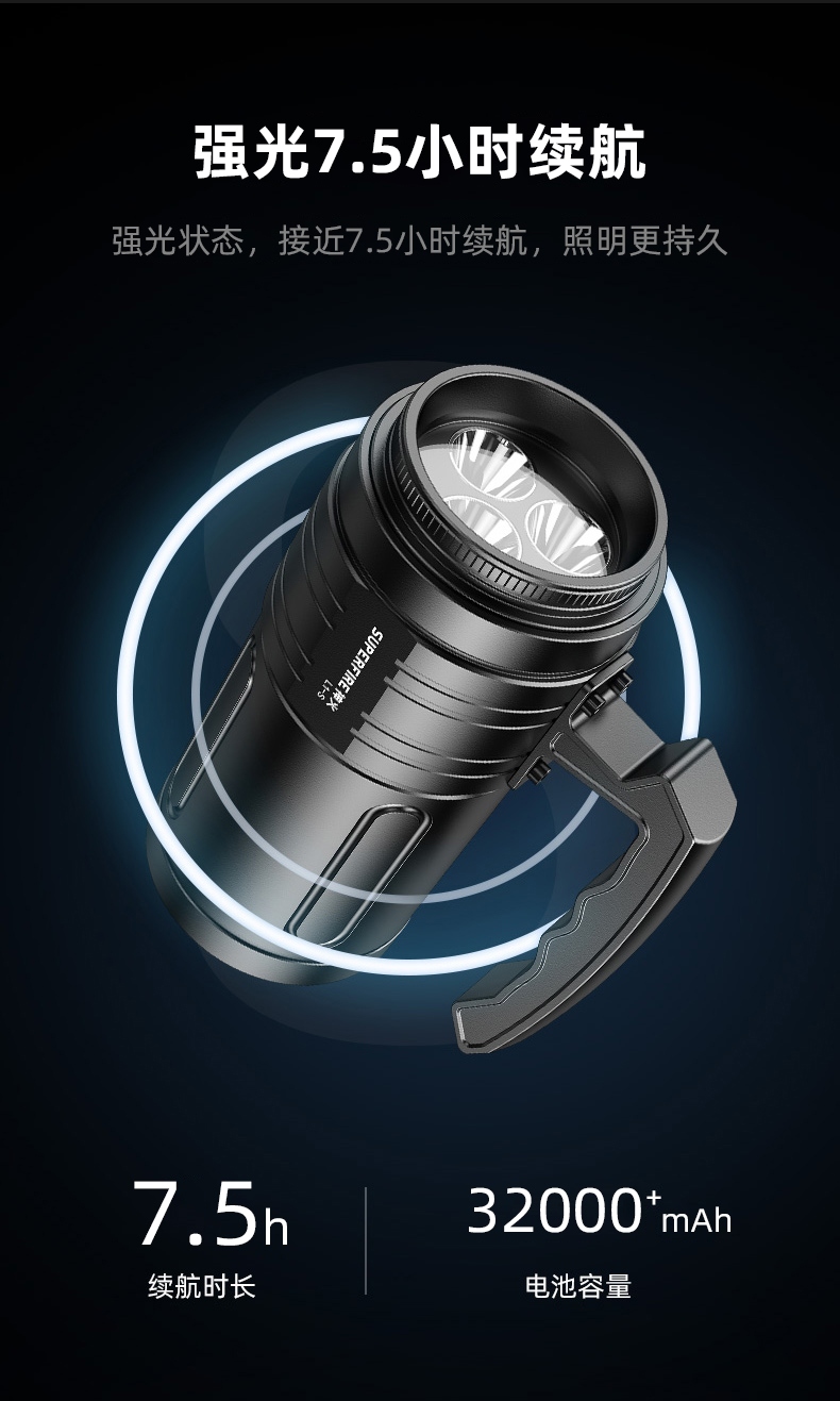 1、超高亮探照灯,最高亮度可达10500lm,大容量32000mAh电池;