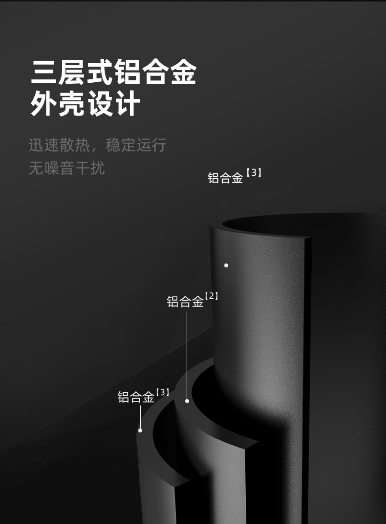 4、三层式铝合金外壳设计,迅速散热,稳定运行,无噪音干扰 。