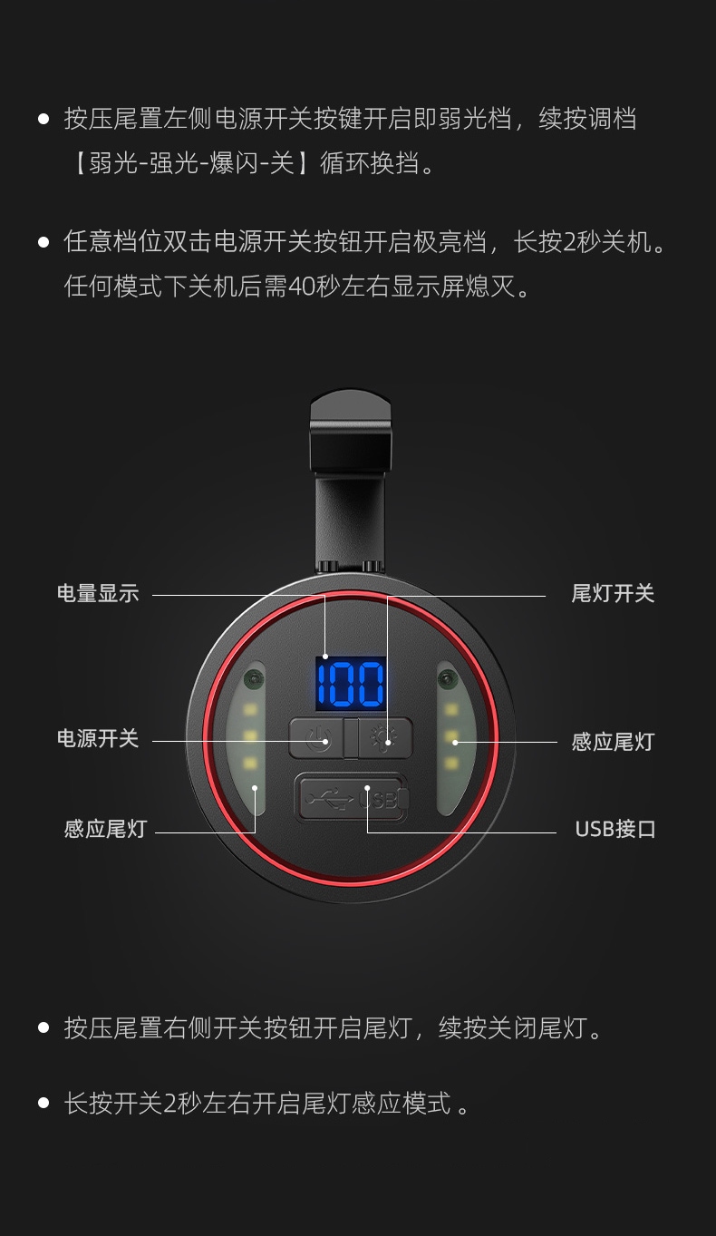 3、按压尾置右侧开关按钮开启尾灯,续按关闭尾灯。长按开关2秒左右开启尾灯感应模式(尾灯开启感应模式无法看清 提示,手扫关闭光源有蓝光提示)。