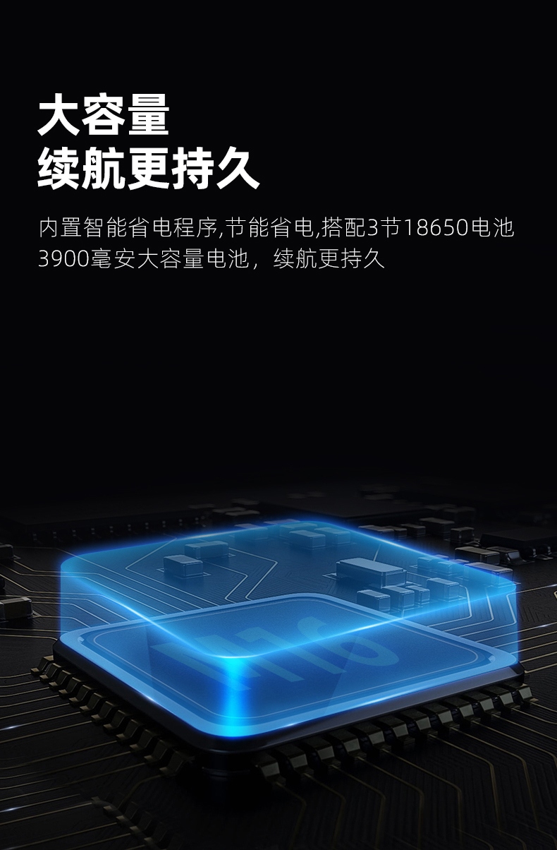 聚光主灯 亮度随心 轻按后端开关按钮,主灯强光点亮,续按依次切换主灯工作光-爆闪光。主灯开启状态下长按5秒,可实现光源色温转换。主灯关闭状态下长按5秒,可开启灯具最亮照明模式。 爆亮强光 亮如白昼 1500LM大功率高亮光源,点亮顷刻如白昼