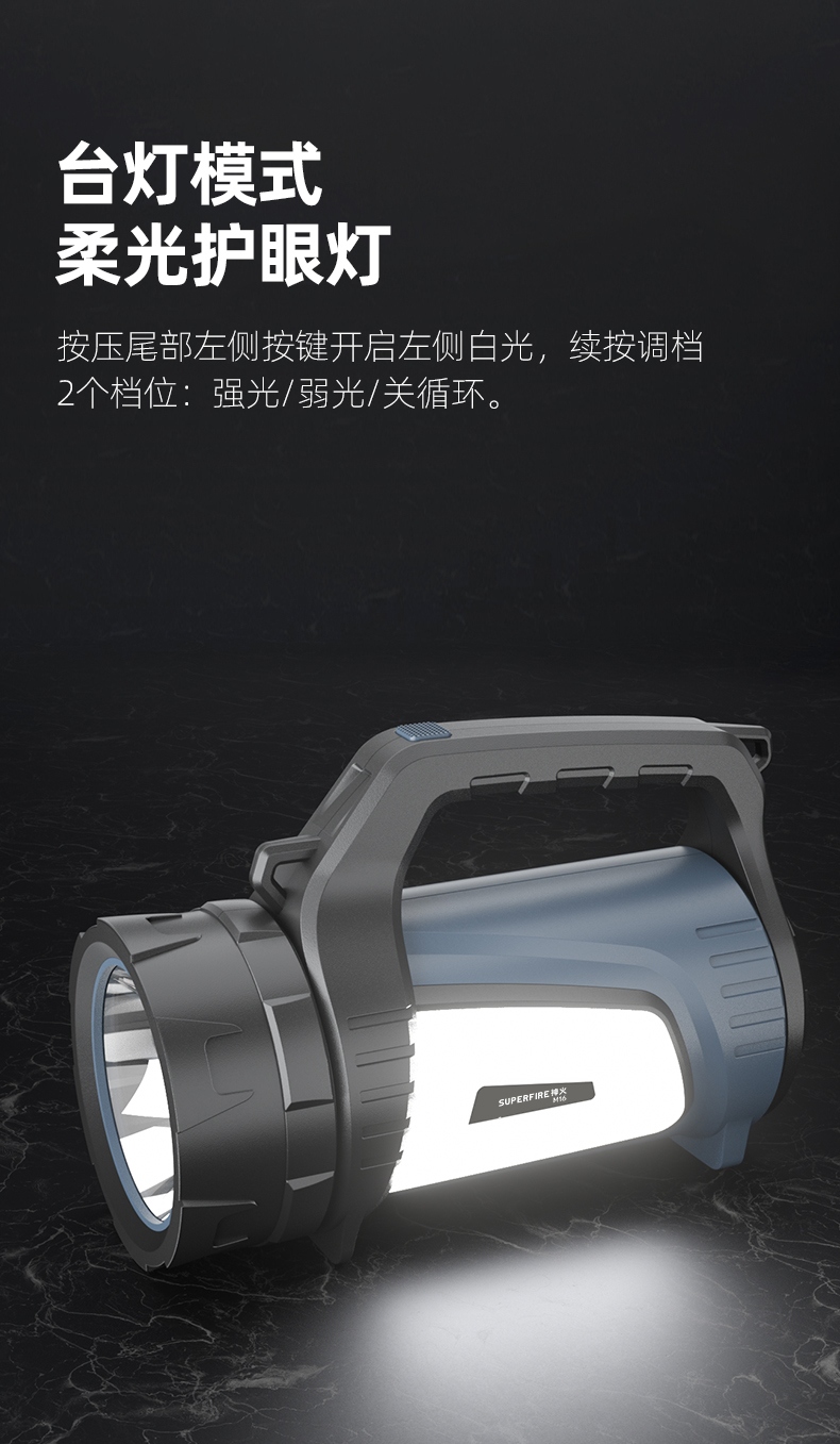 1、多档调光,可满足不同使用场景下的照明需求; 2、含提手,握感更舒适。携带更简单; 3、新型高亮远射灯珠,60W大功率,亮度高,照明效果好。