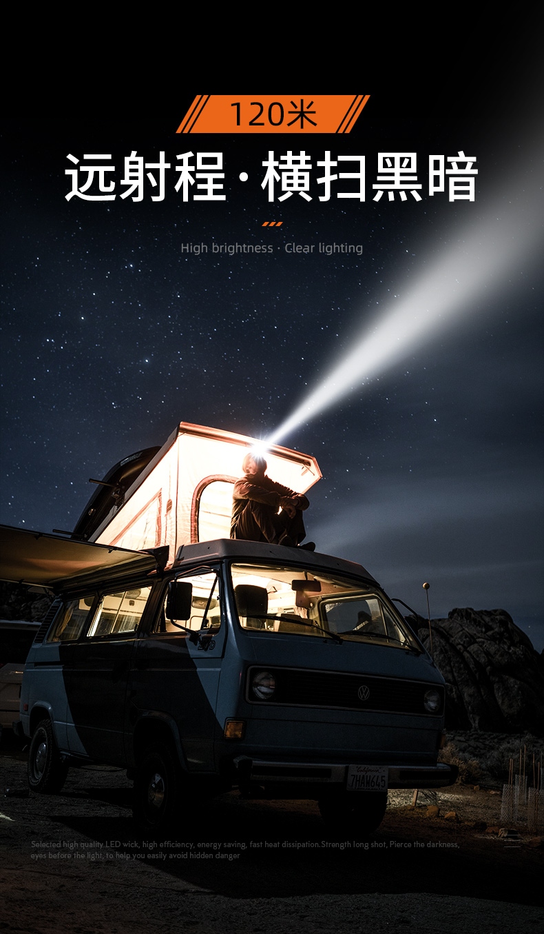 1、多档调光,可满足不同使用场景下的照明需求; 2、含提手,握感更舒适。携带更简单; 3、新型高亮远射灯珠,60W大功率,亮度高,照明效果好。
