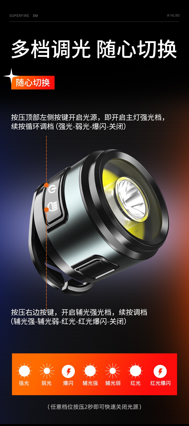 1、六档调光,可满足不同使用场景下的照明需求。 2、进口高亮朗明纳斯灯珠,照明效果更好。 3、含档位记忆,任意档位快捷关机 ,开机恢复关机前档位。