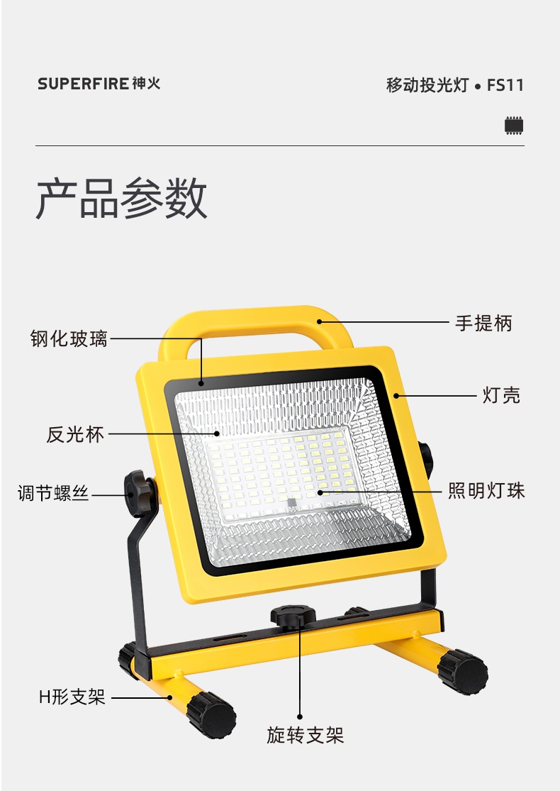 1、多档调光,可满足不同使用场景下的照明需求; 2、含提手,握感更舒适。携带更简单; 3、新型高亮远射灯珠,60W大功率,亮度高,照明效果好。