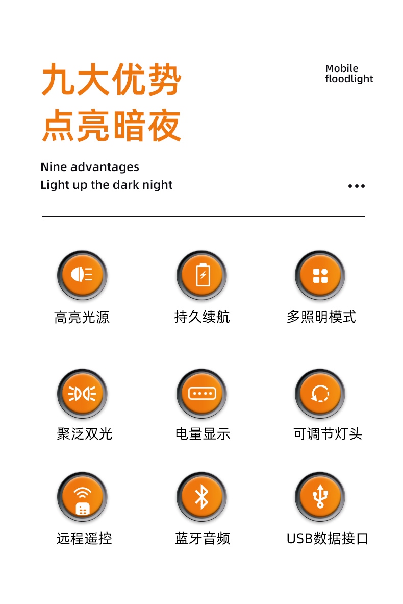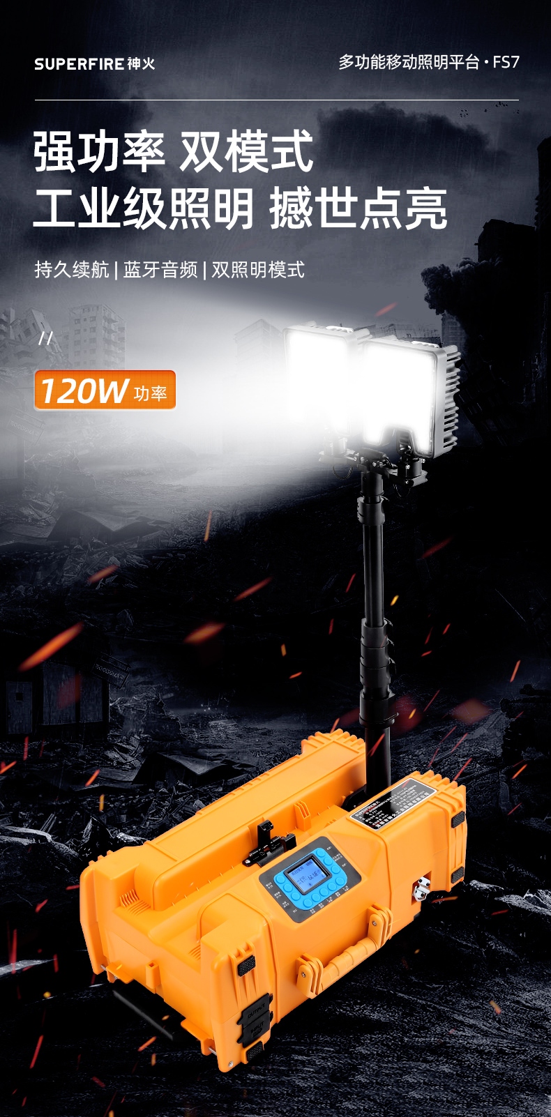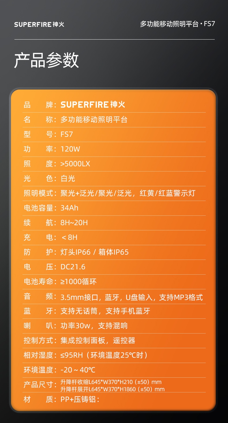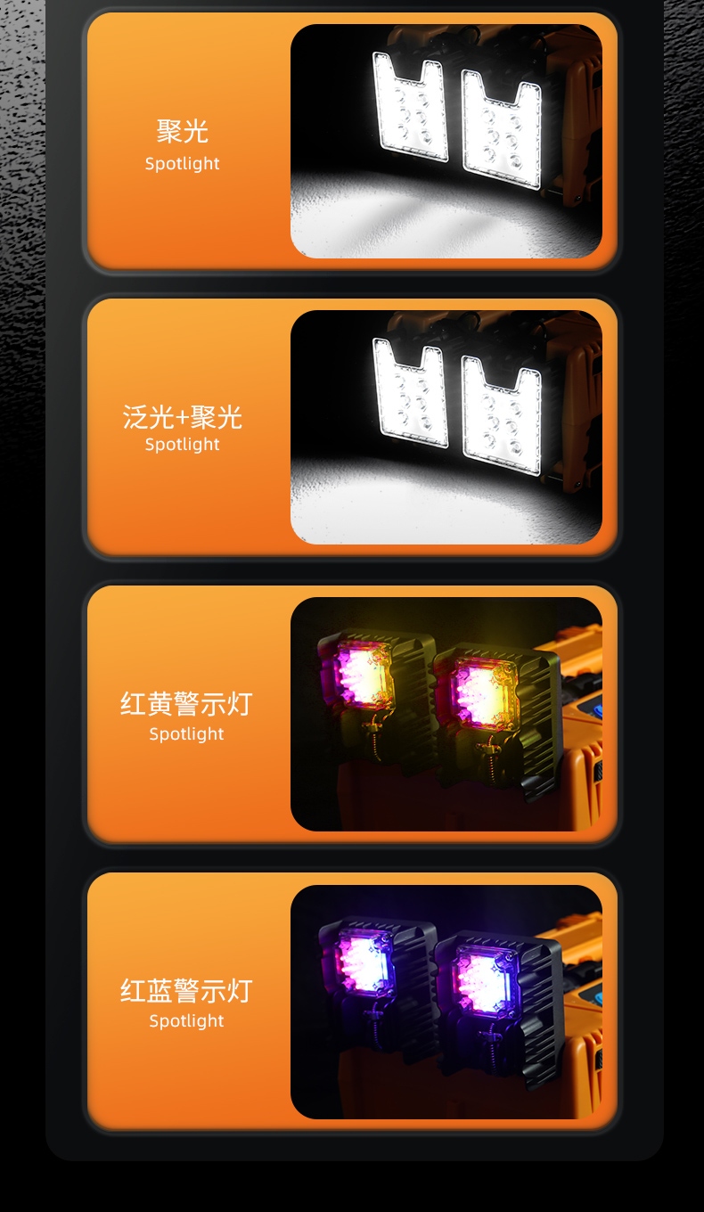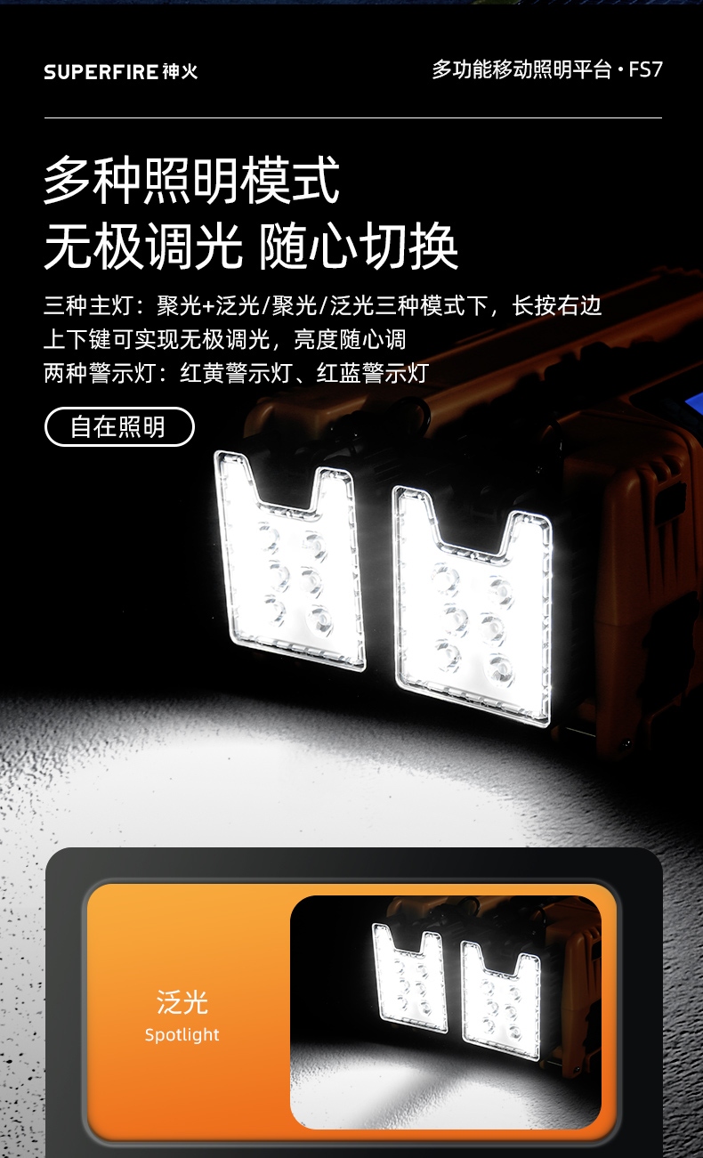 1、三种主灯:聚光+泛光/聚光/泛光三种模式下,长按右边上下键可实现无极调光,,两种警示灯:红黄警示灯、红蓝警示灯;