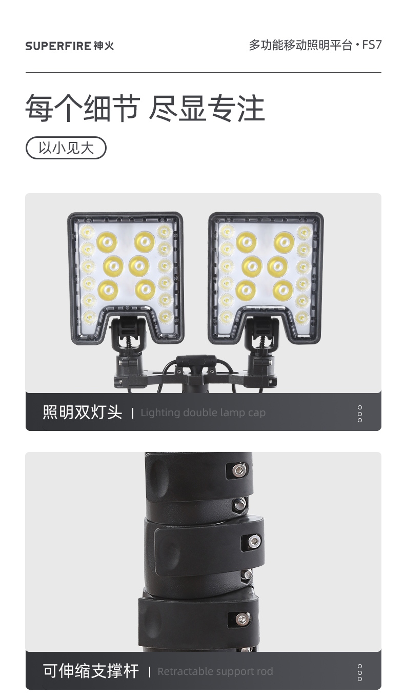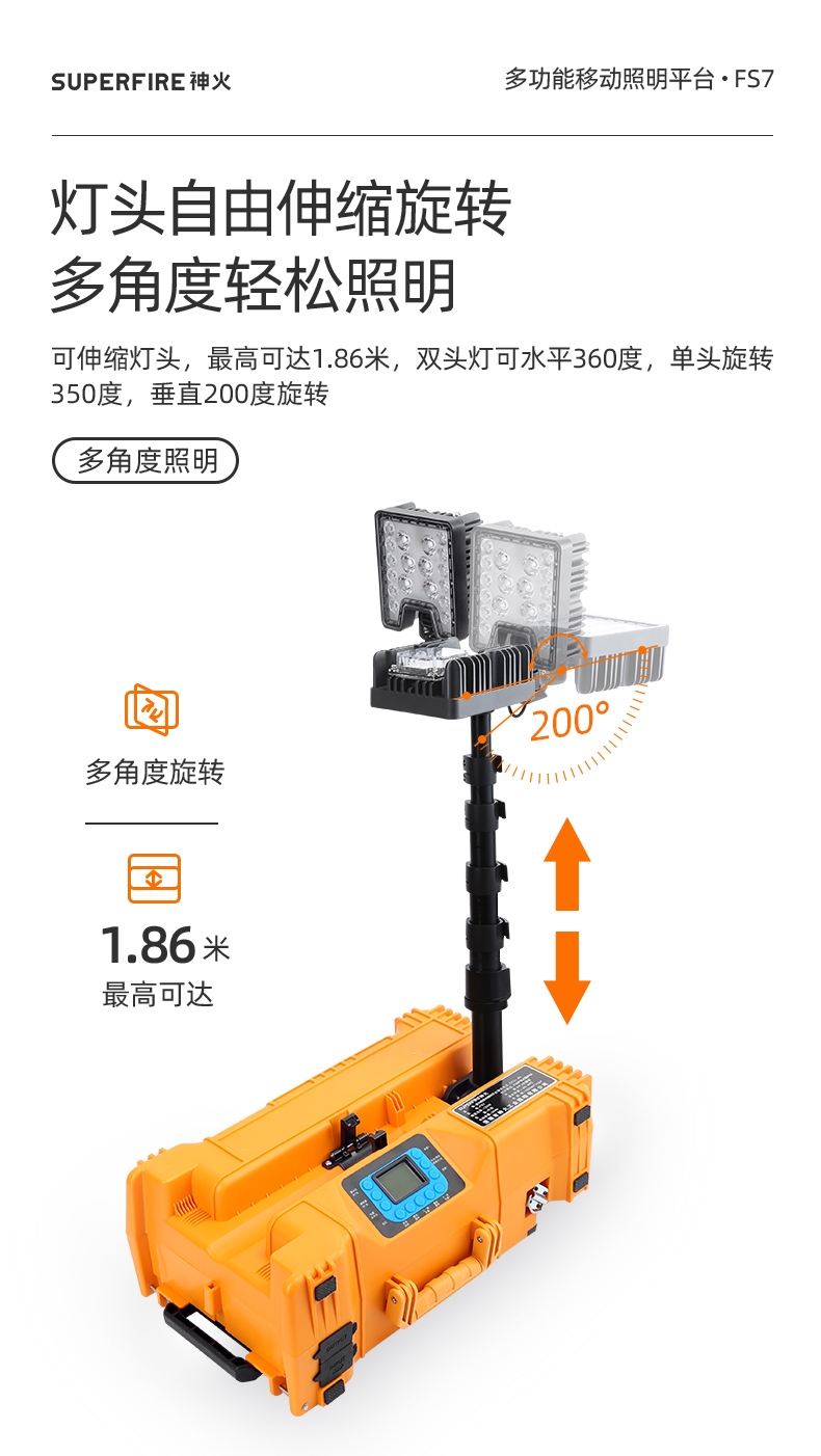 3、灯头自由伸缩旋转,多角度轻松照明,灯头伸缩最高可达1.86米,双头灯可水平360°,单头旋转350°,垂直200度旋转;