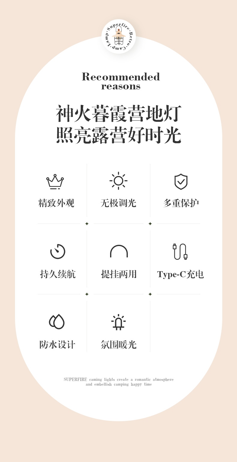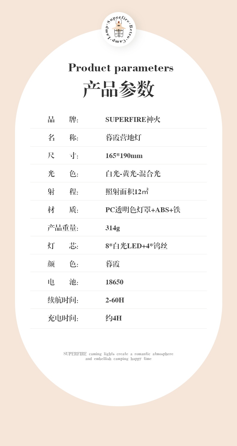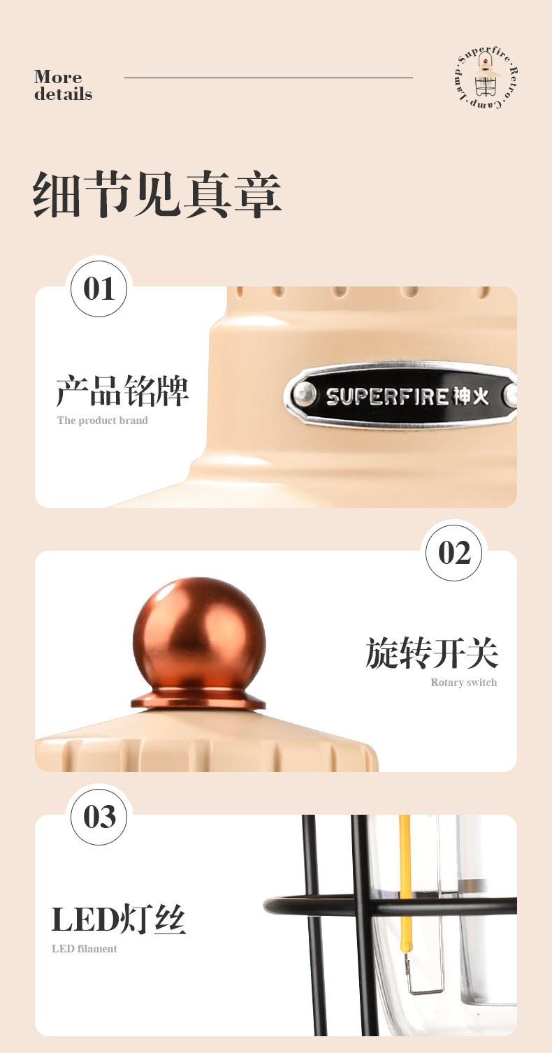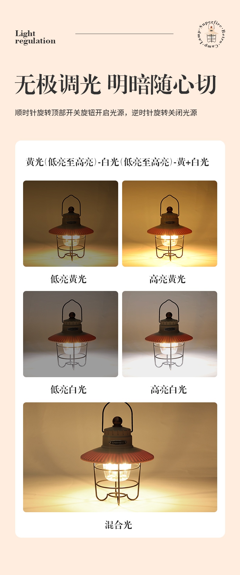 1、六档调光,可满足不同使用场景下的照明需求。 2、进口高亮朗明纳斯灯珠,照明效果更好。 3、含档位记忆,任意档位快捷关机 ,开机恢复关机前档位。