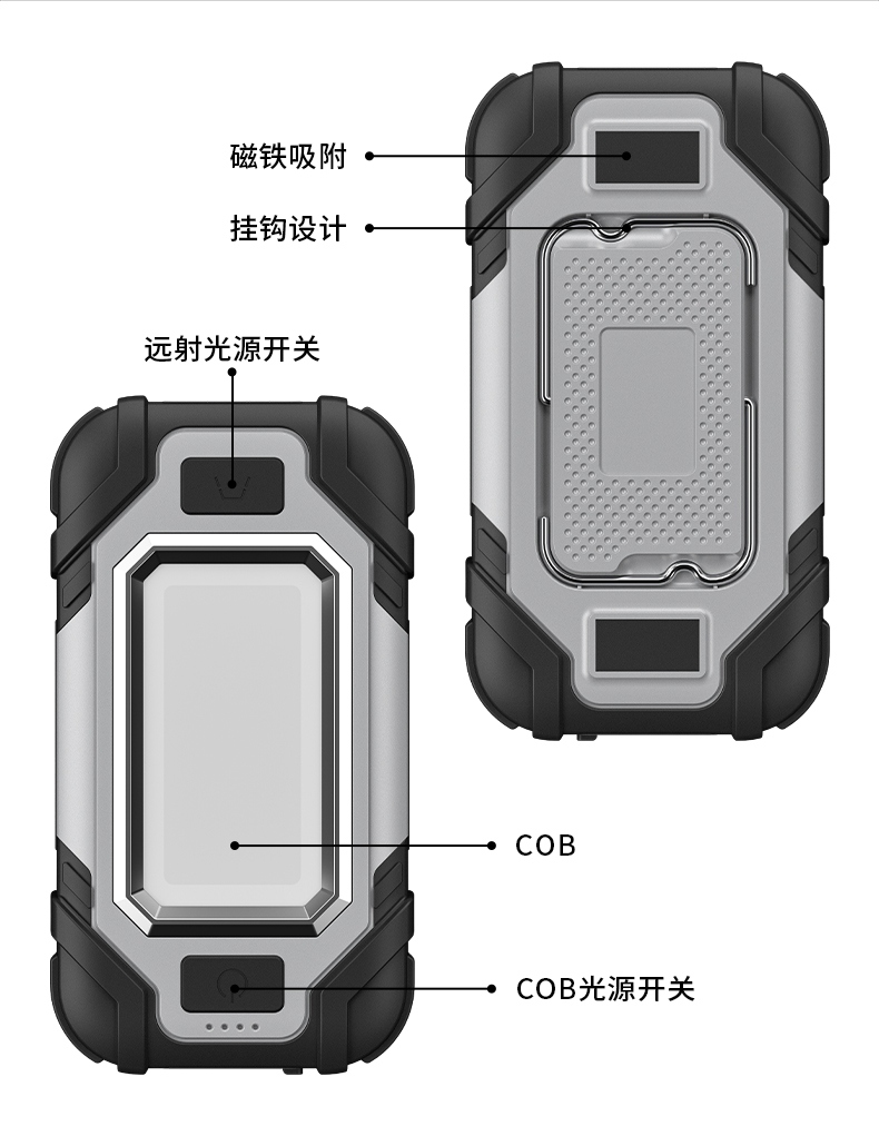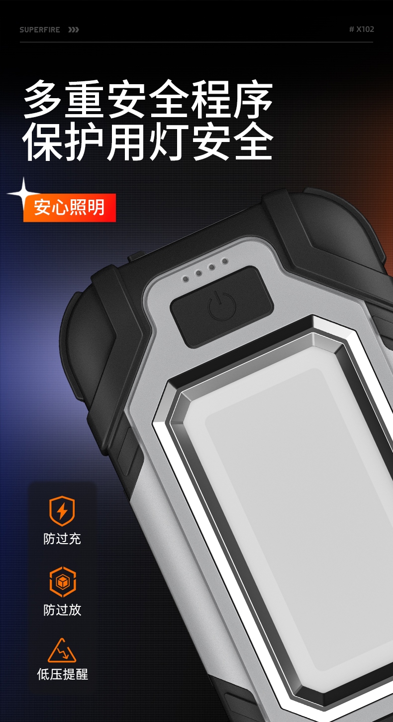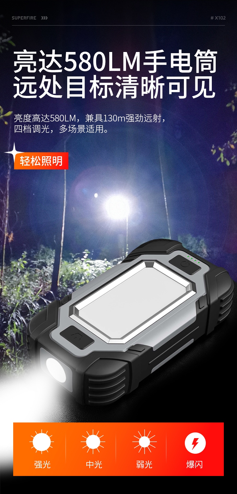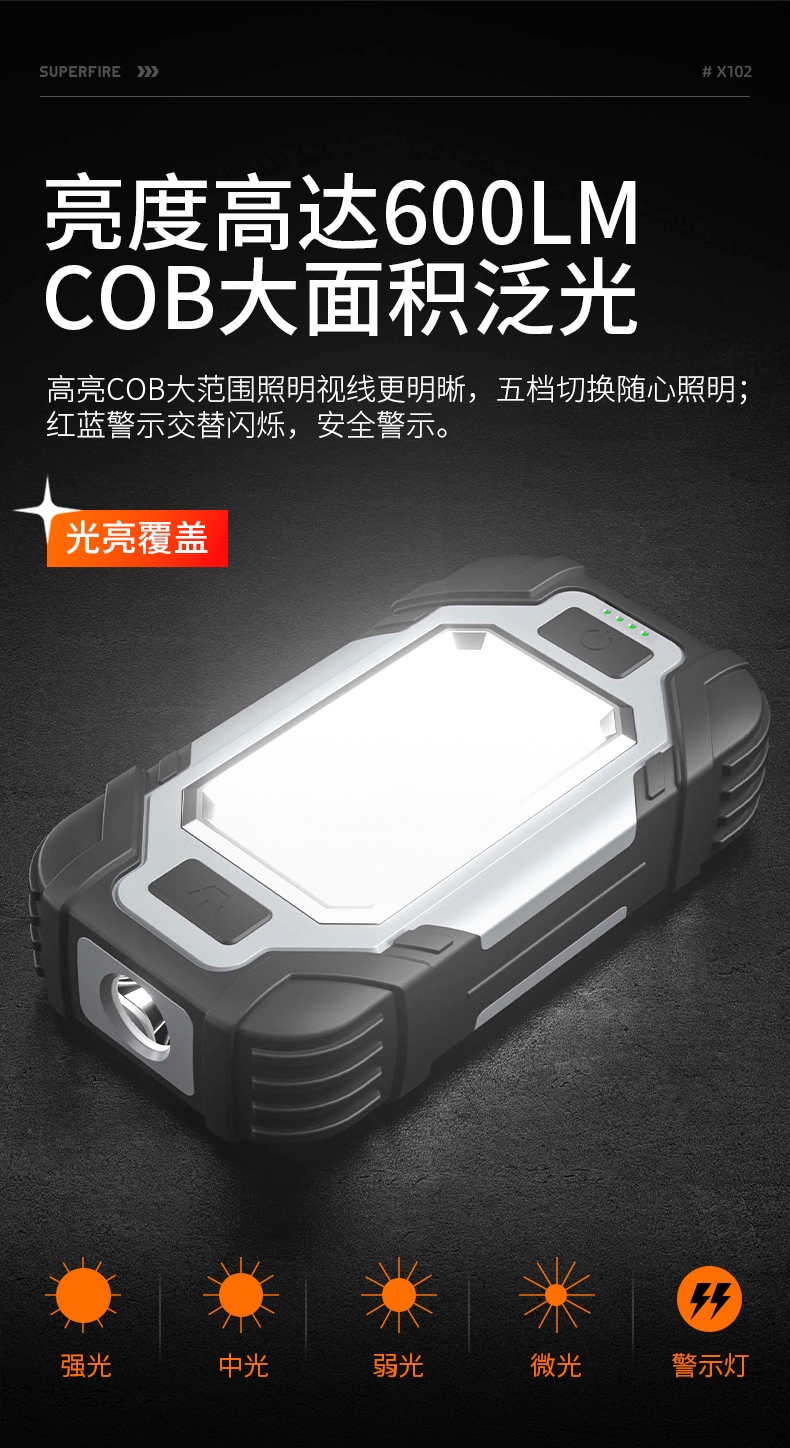 1、多档调光,可满足不同使用场景下的照明需求; 2、含提手,握感更舒适。携带更简单; 3、新型高亮远射灯珠,60W大功率,亮度高,照明效果好。