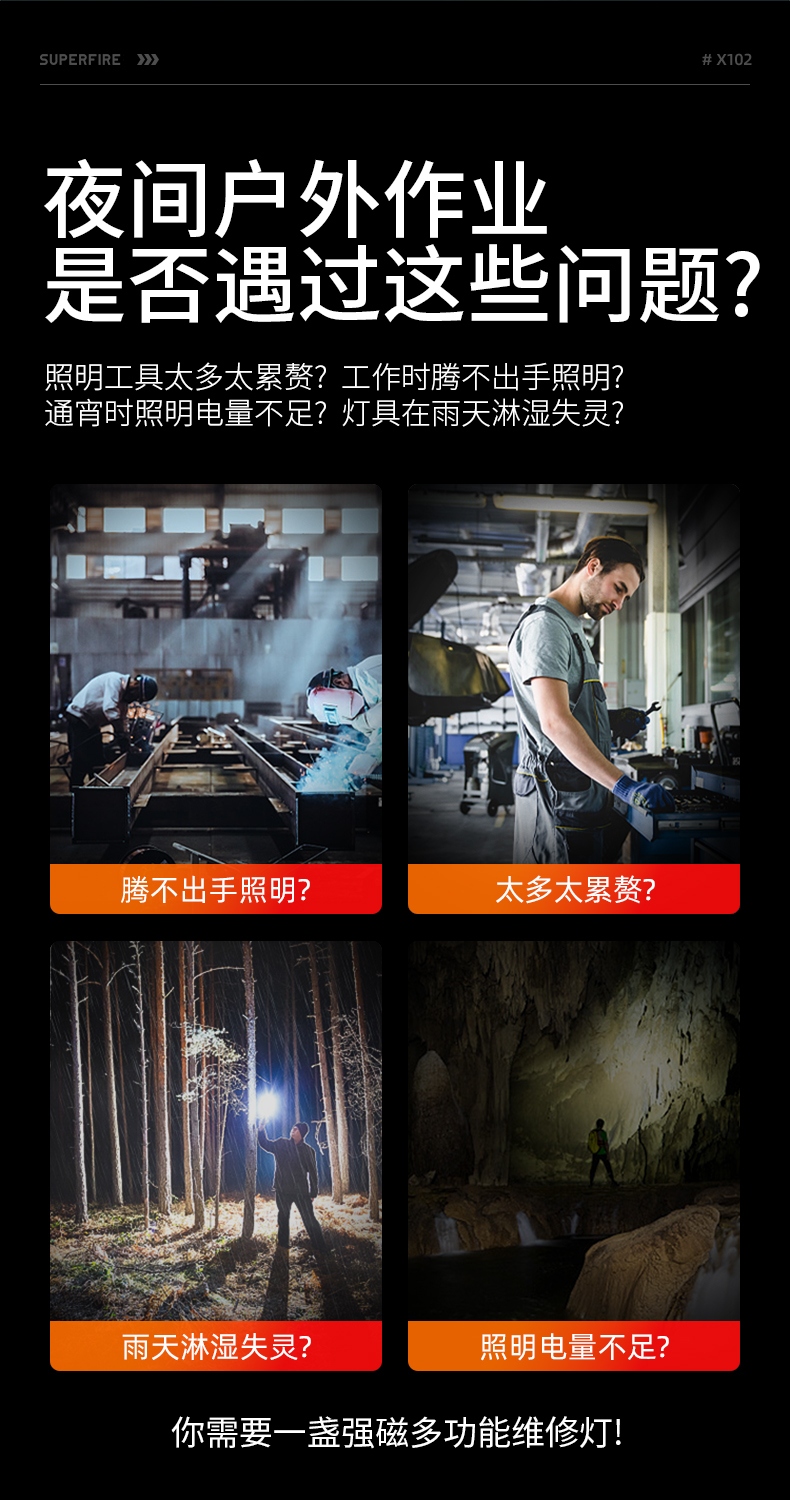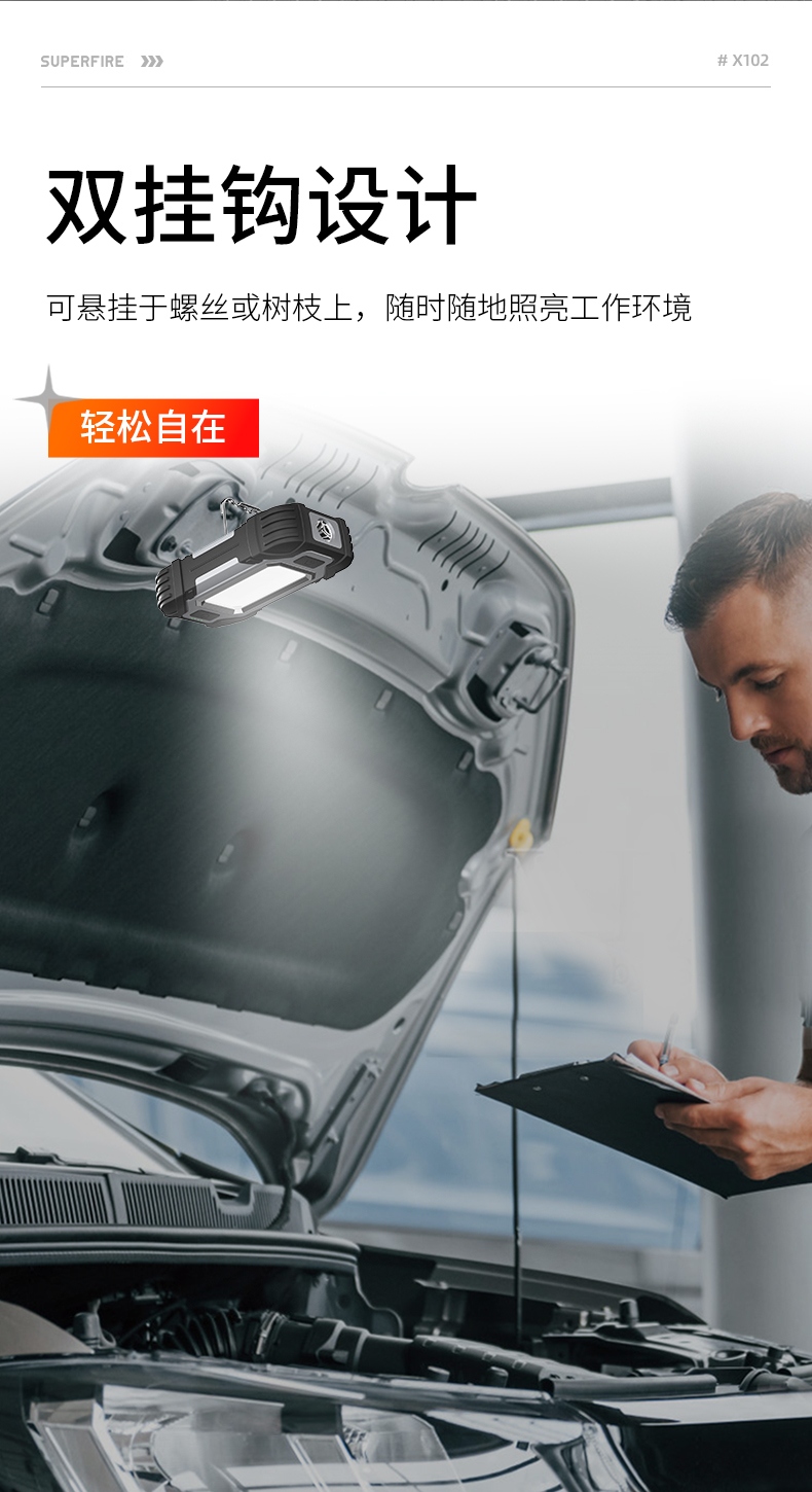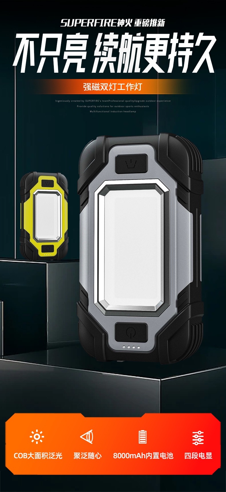 1、多档调光,可满足不同使用场景下的照明需求; 2、含提手,握感更舒适。携带更简单; 3、新型高亮远射灯珠,60W大功率,亮度高,照明效果好。
