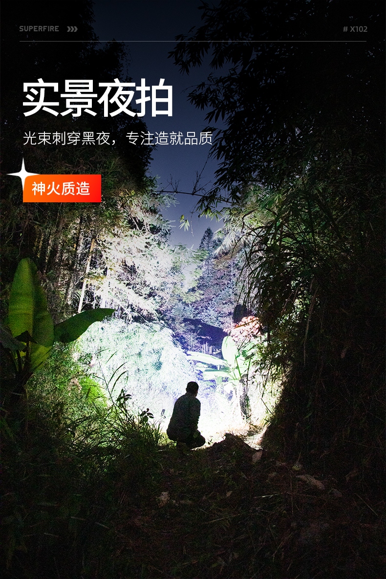 1、千米远射,射程更远,光斑更聚焦。 2、进口灯珠,亮度高,照明效果更好。 3、前后双按键,光源一键点亮,高亮瞬间开启。