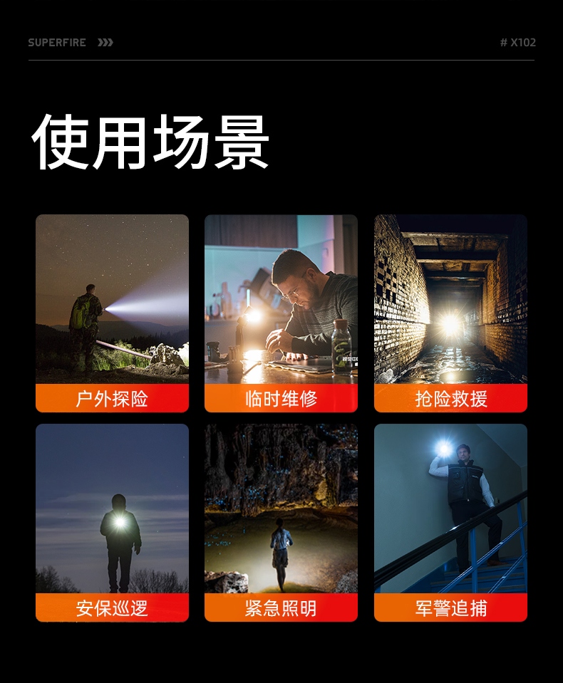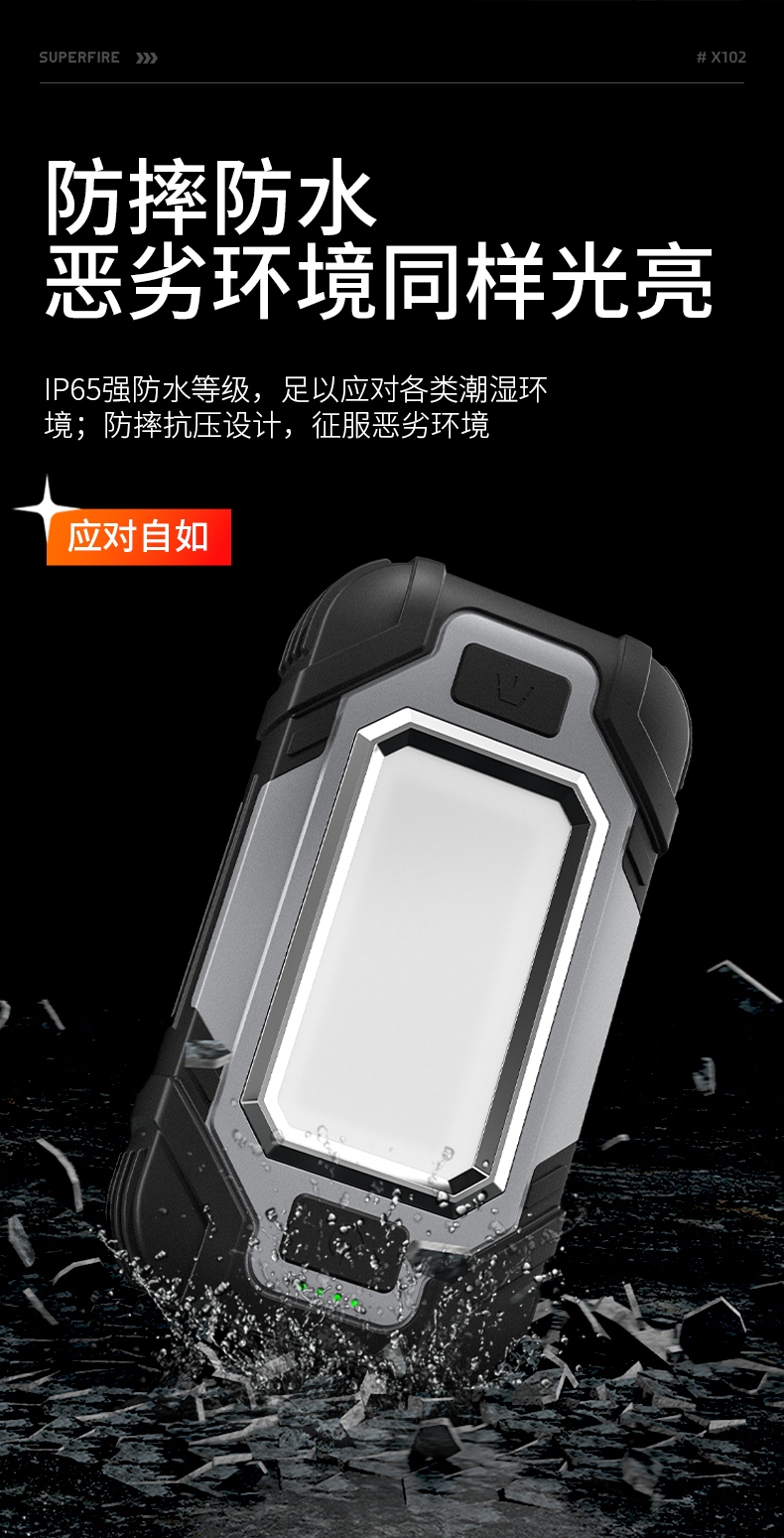 聚光主灯 亮度随心 轻按后端开关按钮,主灯强光点亮,续按依次切换主灯工作光-爆闪光。主灯开启状态下长按5秒,可实现光源色温转换。主灯关闭状态下长按5秒,可开启灯具最亮照明模式。 爆亮强光 亮如白昼 1500LM大功率高亮光源,点亮顷刻如白昼