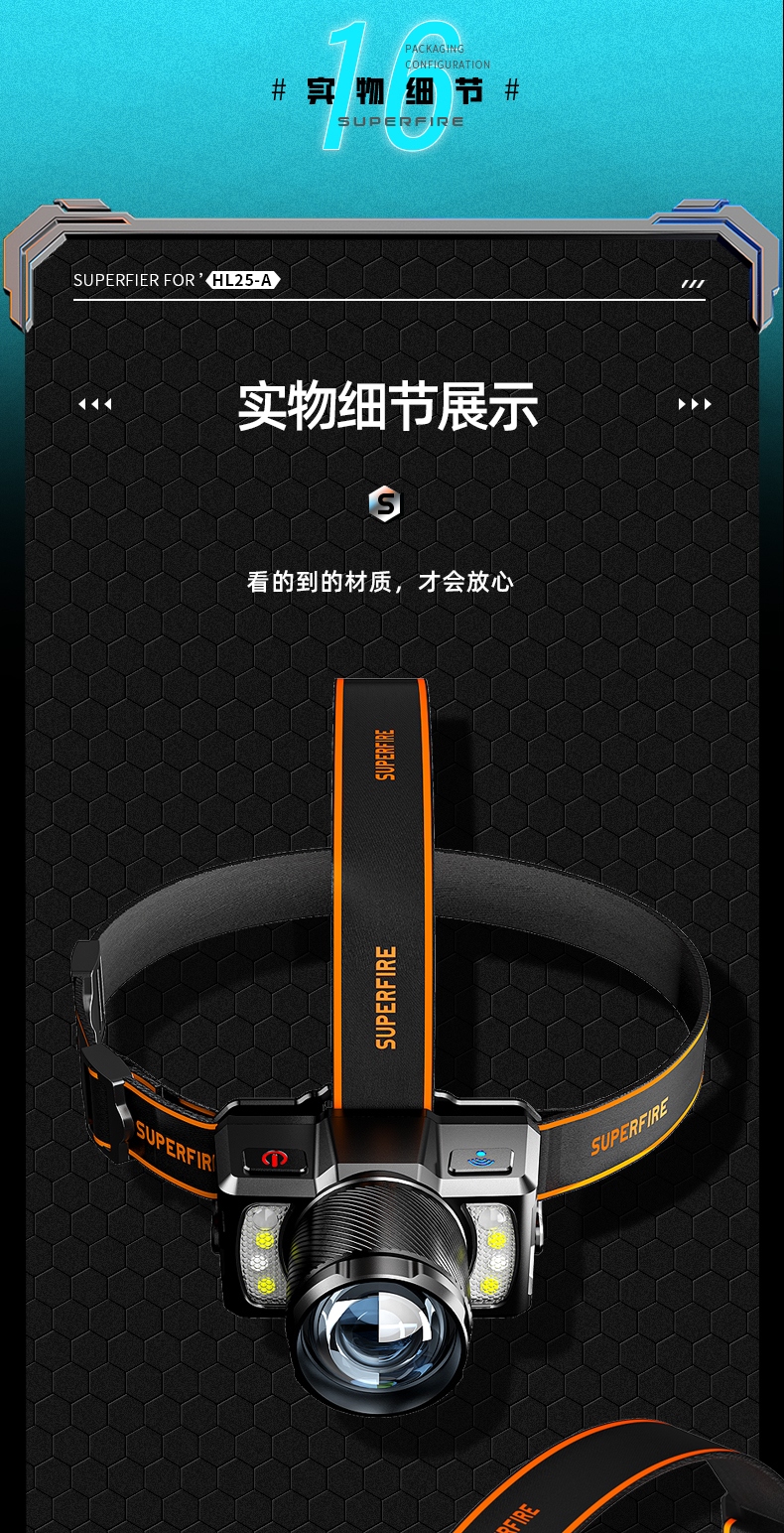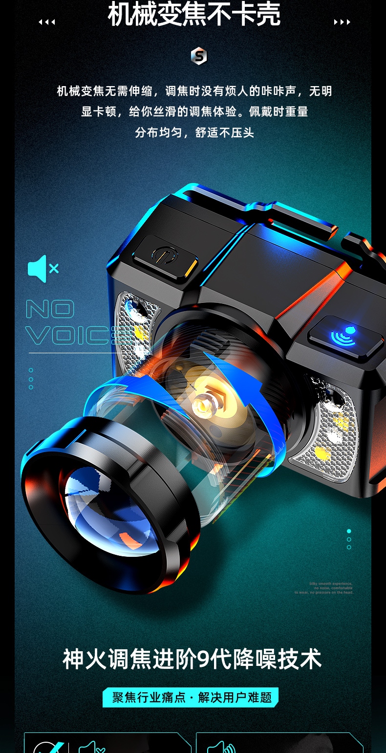 强光亮度,运动头灯,前后均衡设计,轻便不压头,可调节式头灯带,佩戴方便舒适,伸缩调焦,光照范围大,照射距离远,头灯角度调节,超90度角度随意调节,适宜各种环境使用