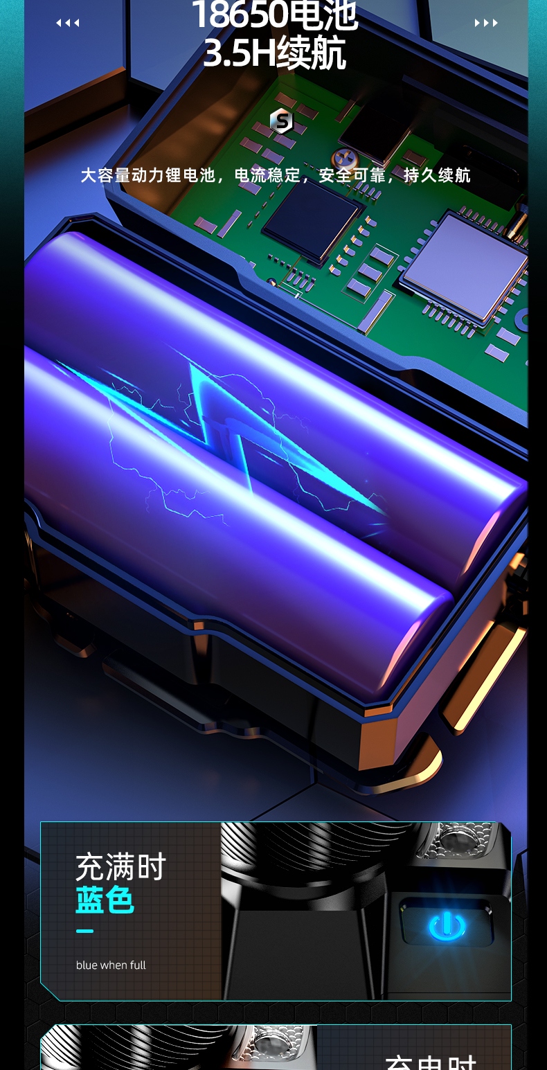 1、充电时红色指示灯常亮,充满时蓝色指示灯常亮多样化充电,使用方便;设有USB充电接口,可使用充电器、充电宝、电脑等设备为灯具充电 2、此款头灯款式潮流、设计小巧、携带方便、头带材质柔软、可自由拆卸、便于清洗。