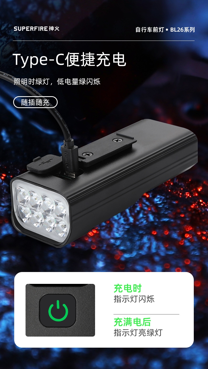 Type-C便捷充电 照明时绿灯,低电量绿闪烁