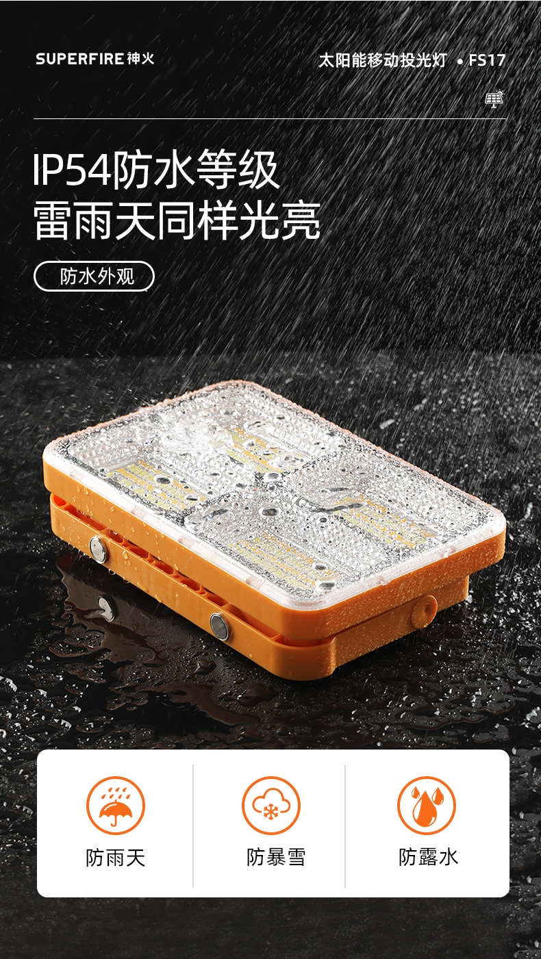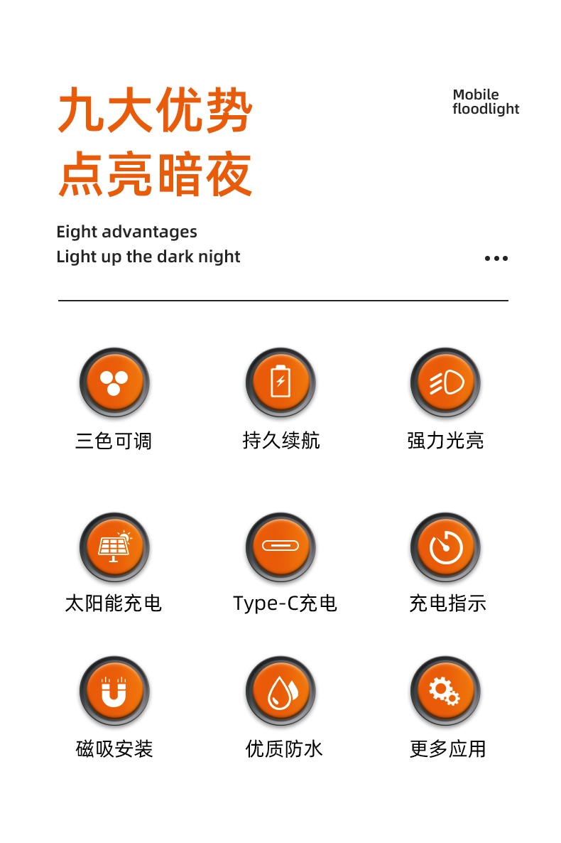 九大优势 点亮暗夜 三色可调 持久续航 强力光亮 太阳能充电 Type-C充电 优质防水 充电指示 磁吸安装