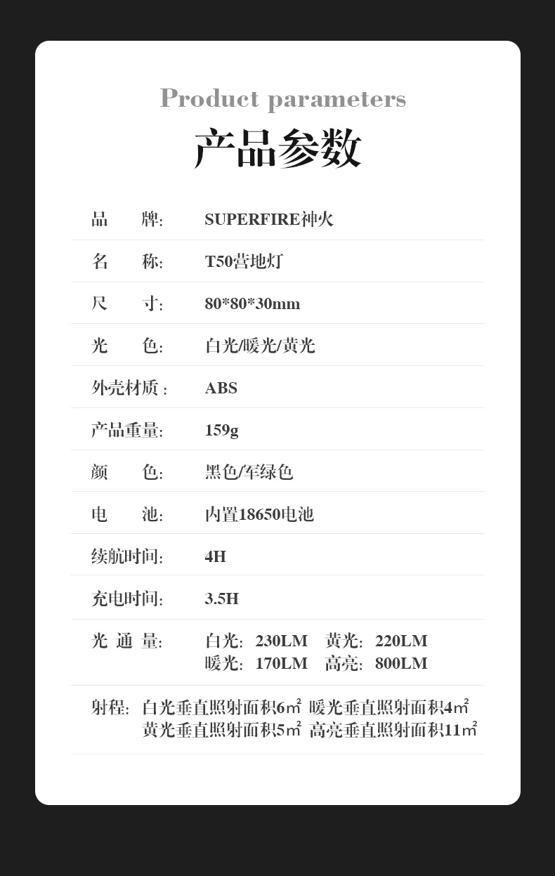 白光:230LM 黄光:220LM 暖光:170LM 高亮:800LM