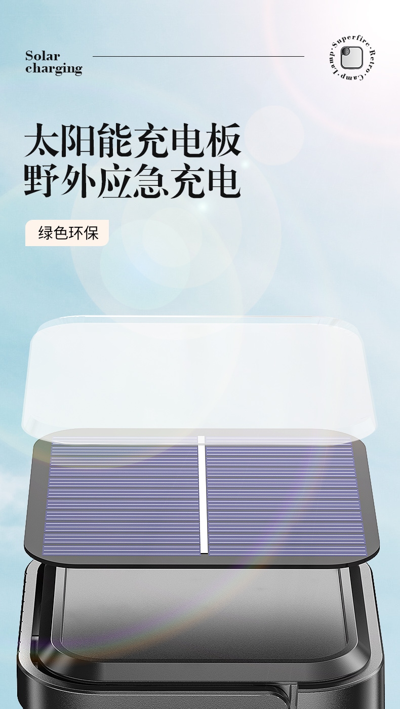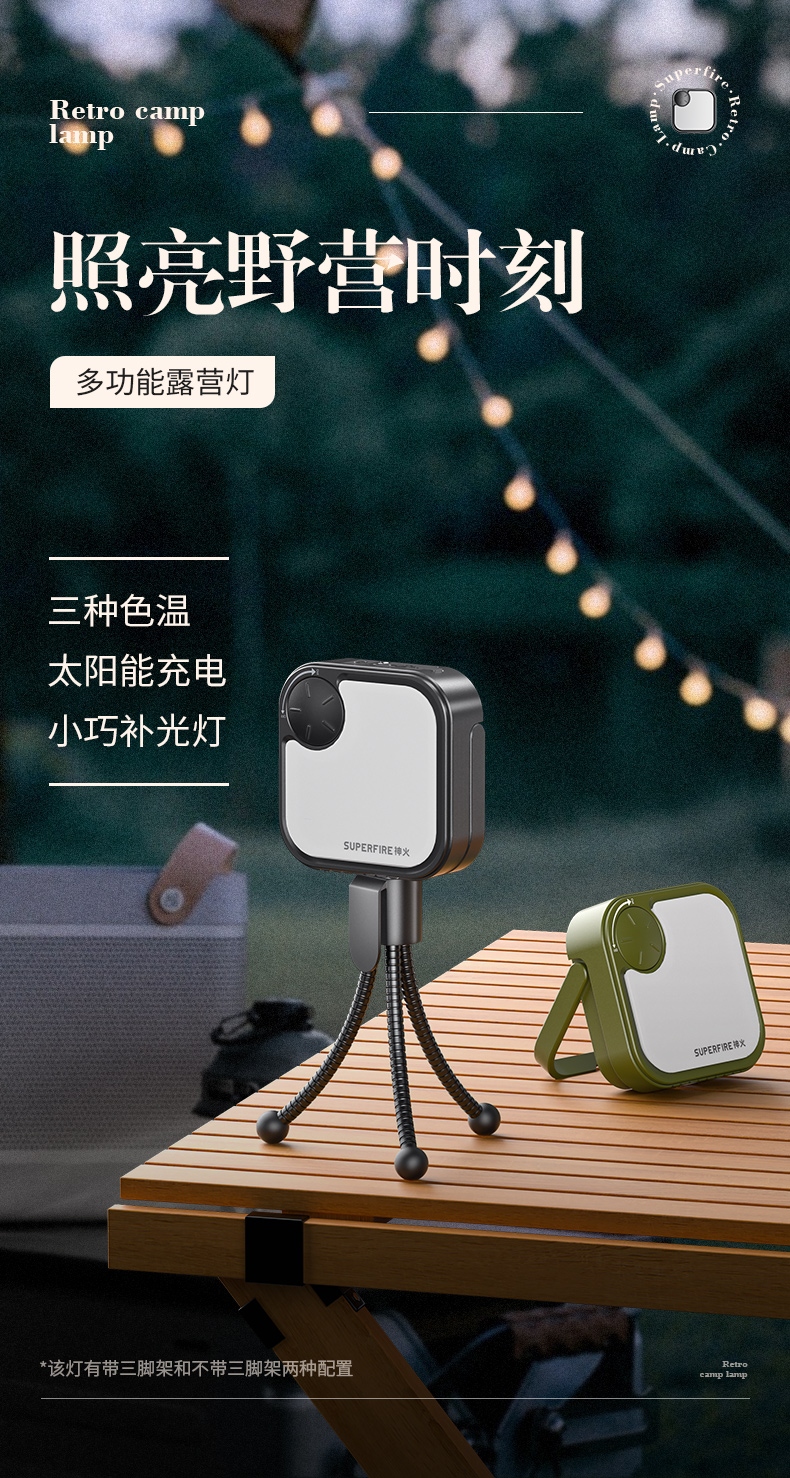 1、.照明角度90°可调节。2.带有云螺母,可做补光灯使用3.带有太阳能电池板,可应急充电