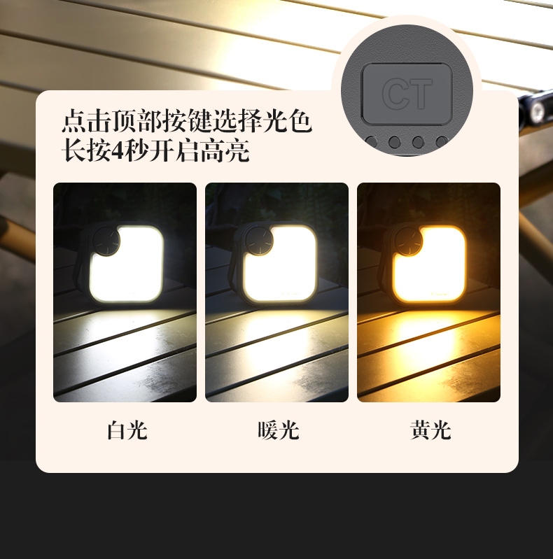1.顺时针旋转顶部旋钮开关即开启白光,由低-高的顺序选择亮度。点按侧边按键开关以白光-暖光-黄光的顺序选择光色。长按4秒开启高亮。