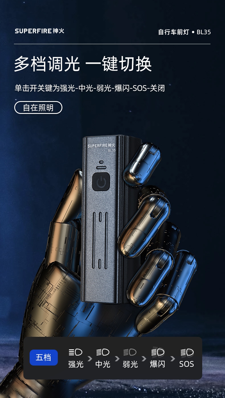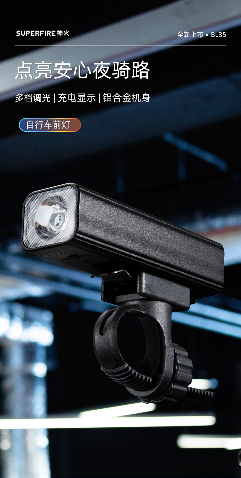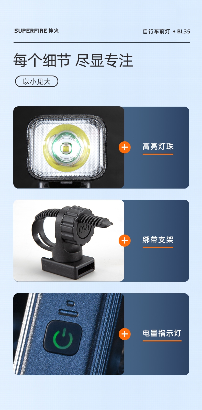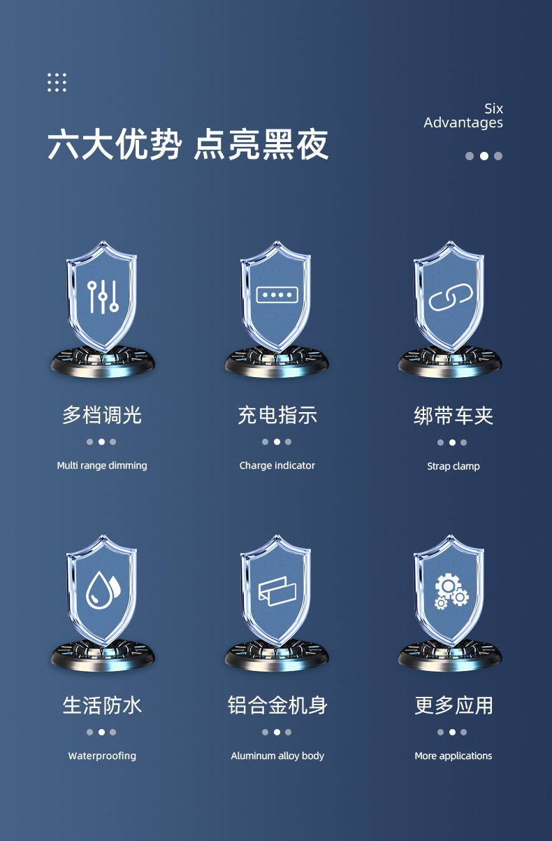 六大优势 电量黑夜 多档调光 充电指示 绑带车夹 生活防水 铝合金机身