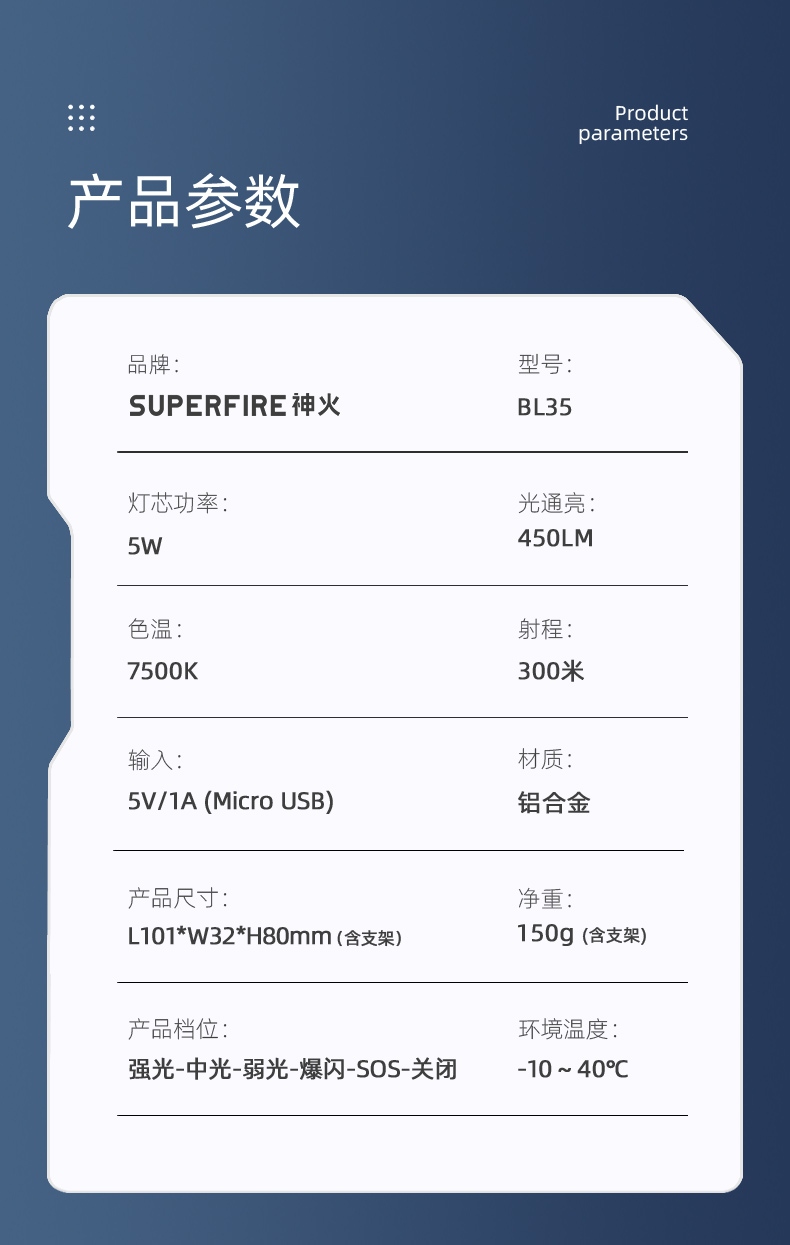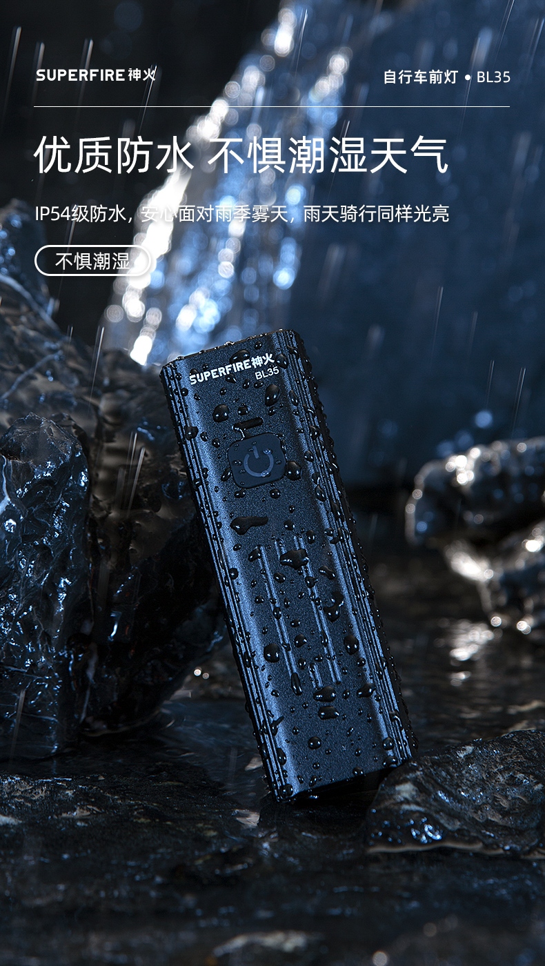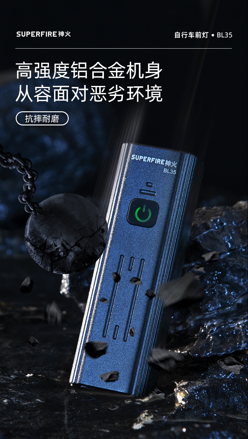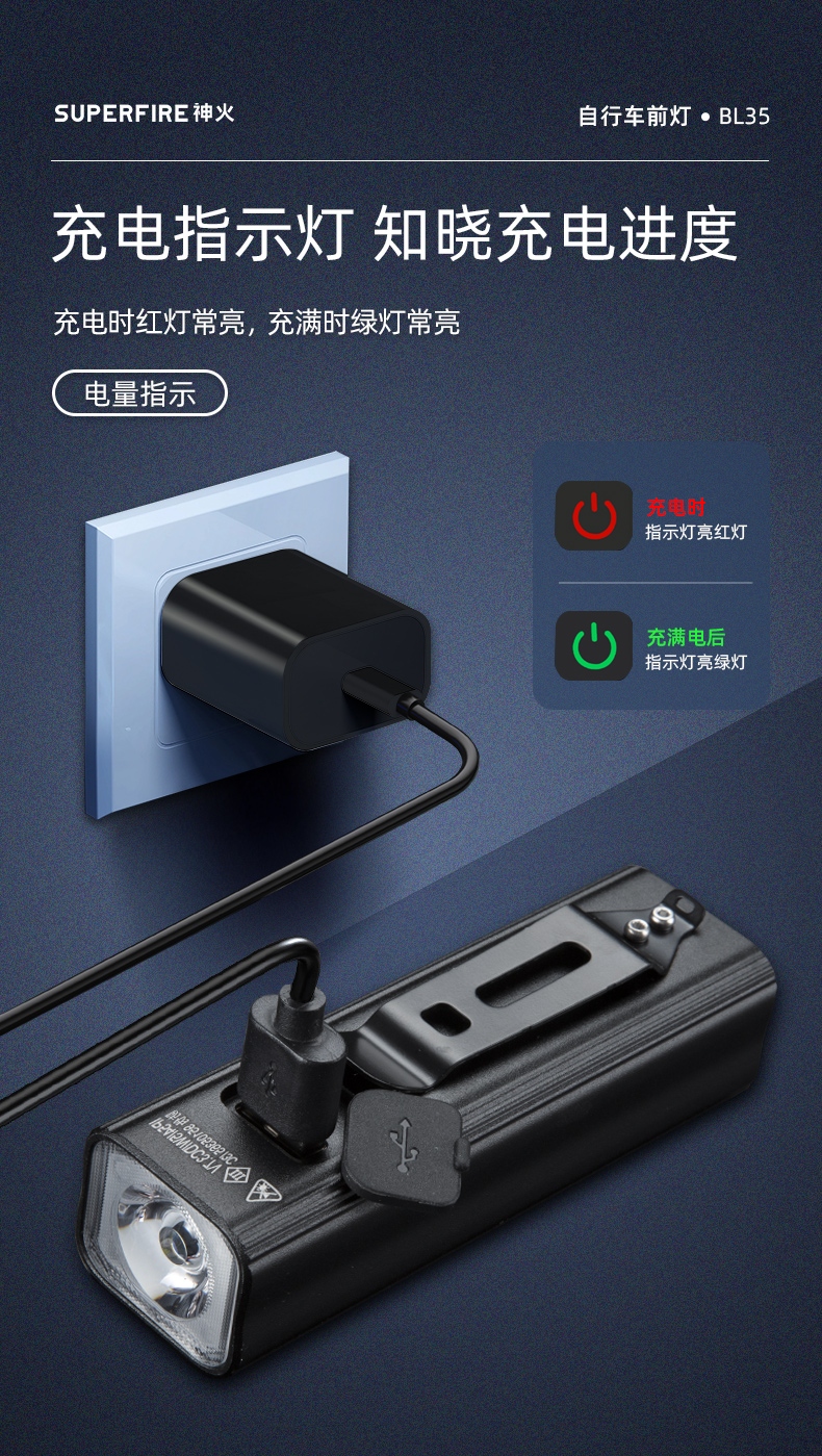六大优势 电量黑夜 多档调光 充电指示 绑带车夹 生活防水 铝合金机身