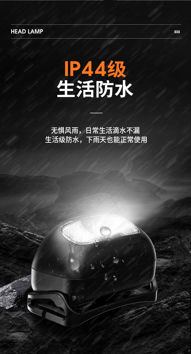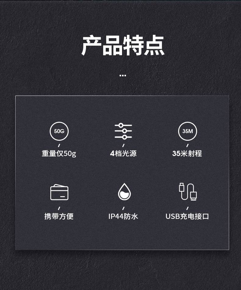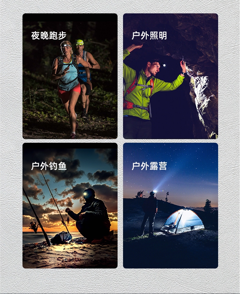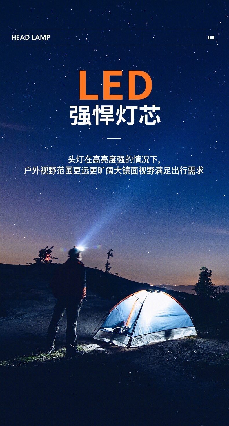 强光亮度,运动头灯,前后均衡设计,轻便不压头,可调节式头灯带,佩戴方便舒适,伸缩调焦,光照范围大,照射距离远,头灯角度调节,超90度角度随意调节,适宜各种环境使用