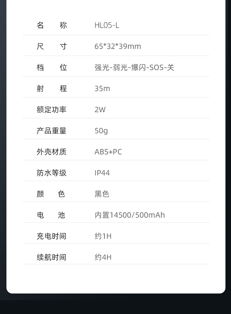 聚光主灯 亮度随心 轻按后端开关按钮,主灯强光点亮,续按依次切换主灯工作光-爆闪光。主灯开启状态下长按5秒,可实现光源色温转换。主灯关闭状态下长按5秒,可开启灯具最亮照明模式。 爆亮强光 亮如白昼 1500LM大功率高亮光源,点亮顷刻如白昼