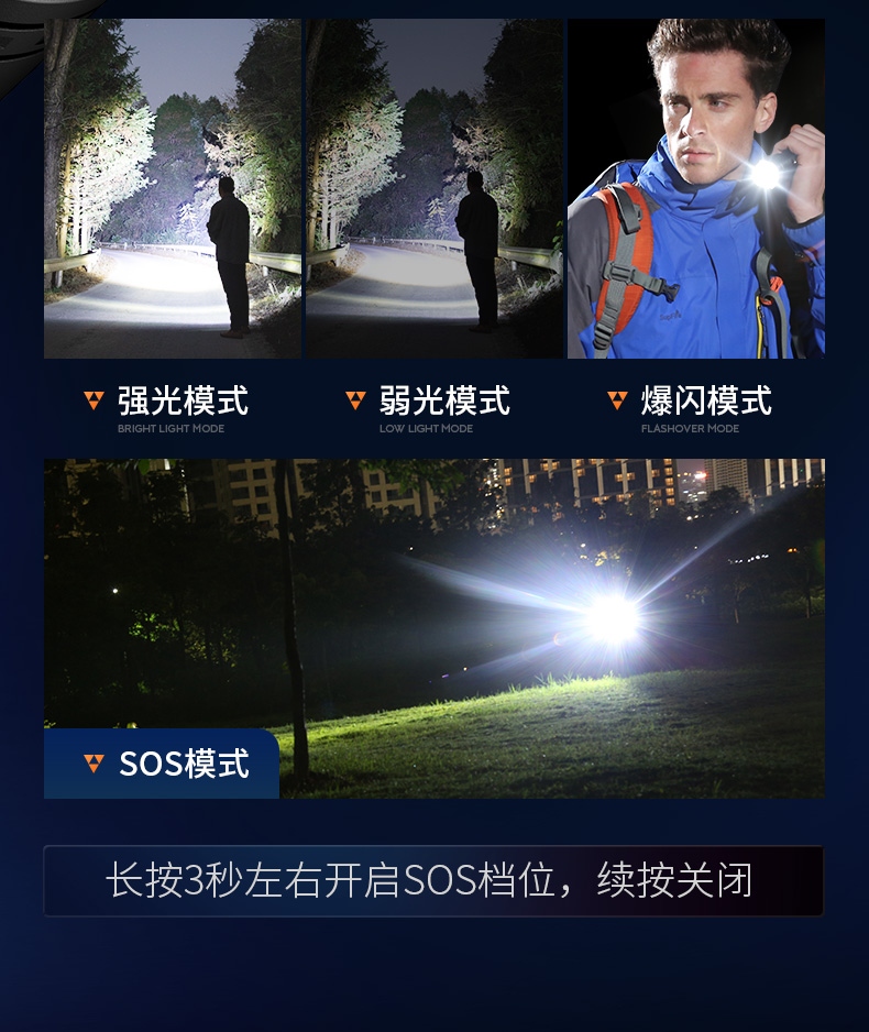 聚光主灯 亮度随心 轻按后端开关按钮,主灯强光点亮,续按依次切换主灯工作光-爆闪光。主灯开启状态下长按5秒,可实现光源色温转换。主灯关闭状态下长按5秒,可开启灯具最亮照明模式。 爆亮强光 亮如白昼 1500LM大功率高亮光源,点亮顷刻如白昼
