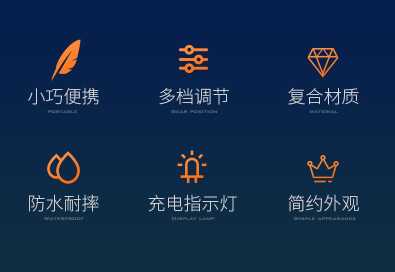 1、六档调光,可满足不同使用场景下的照明需求。 2、进口高亮朗明纳斯灯珠,照明效果更好。 3、含档位记忆,任意档位快捷关机 ,开机恢复关机前档位。