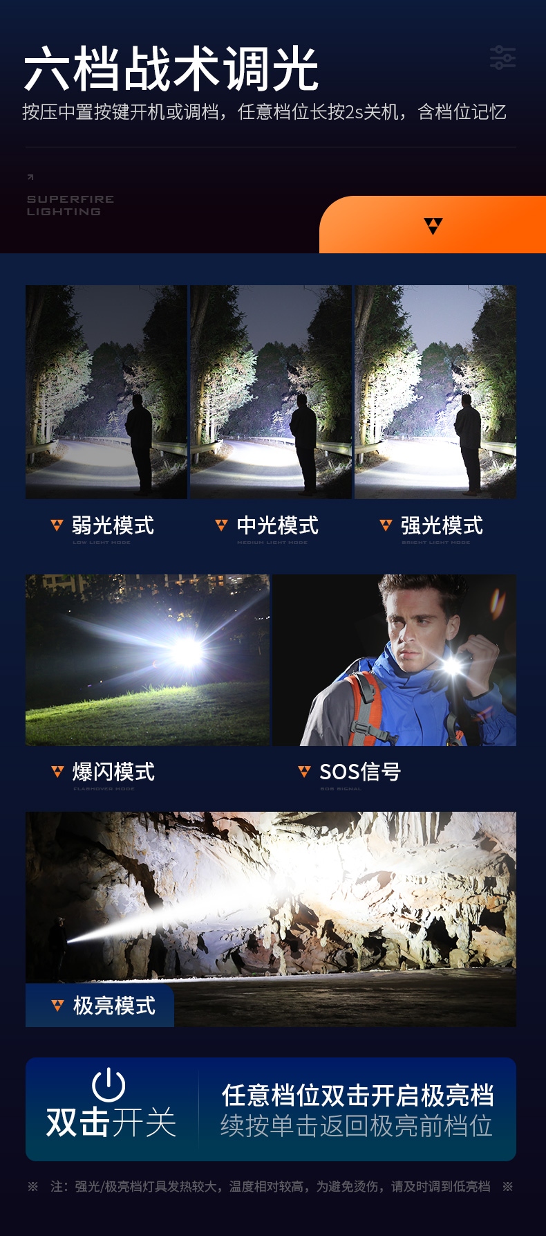 1、六档调光,可满足不同使用场景下的照明需求。 2、进口高亮朗明纳斯灯珠,照明效果更好。 3、含档位记忆,任意档位快捷关机 ,开机恢复关机前档位。
