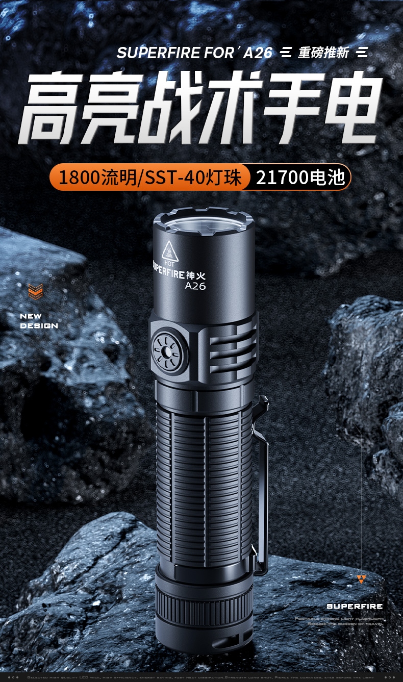 1、千米远射,射程更远,光斑更聚焦。 2、进口灯珠,亮度高,照明效果更好。 3、前后双按键,光源一键点亮,高亮瞬间开启。