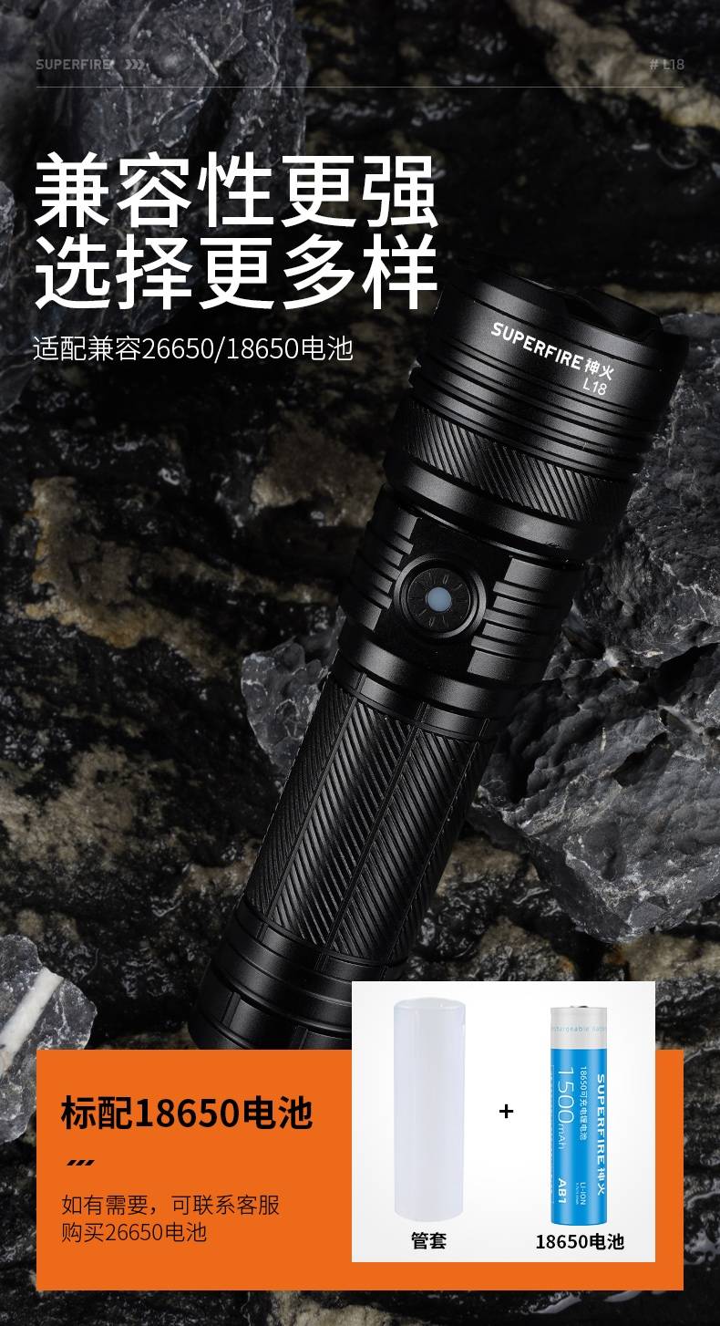 1、千米远射,射程更远,光斑更聚焦。 2、进口灯珠,亮度高,照明效果更好。 3、前后双按键,光源一键点亮,高亮瞬间开启。