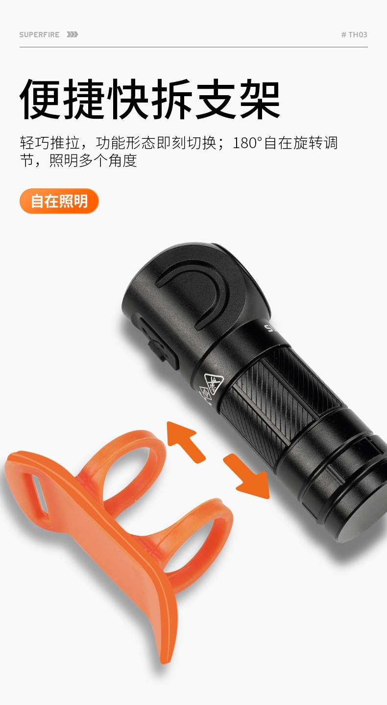 1.一灯两用,既是小巧头灯也是拐角手电。