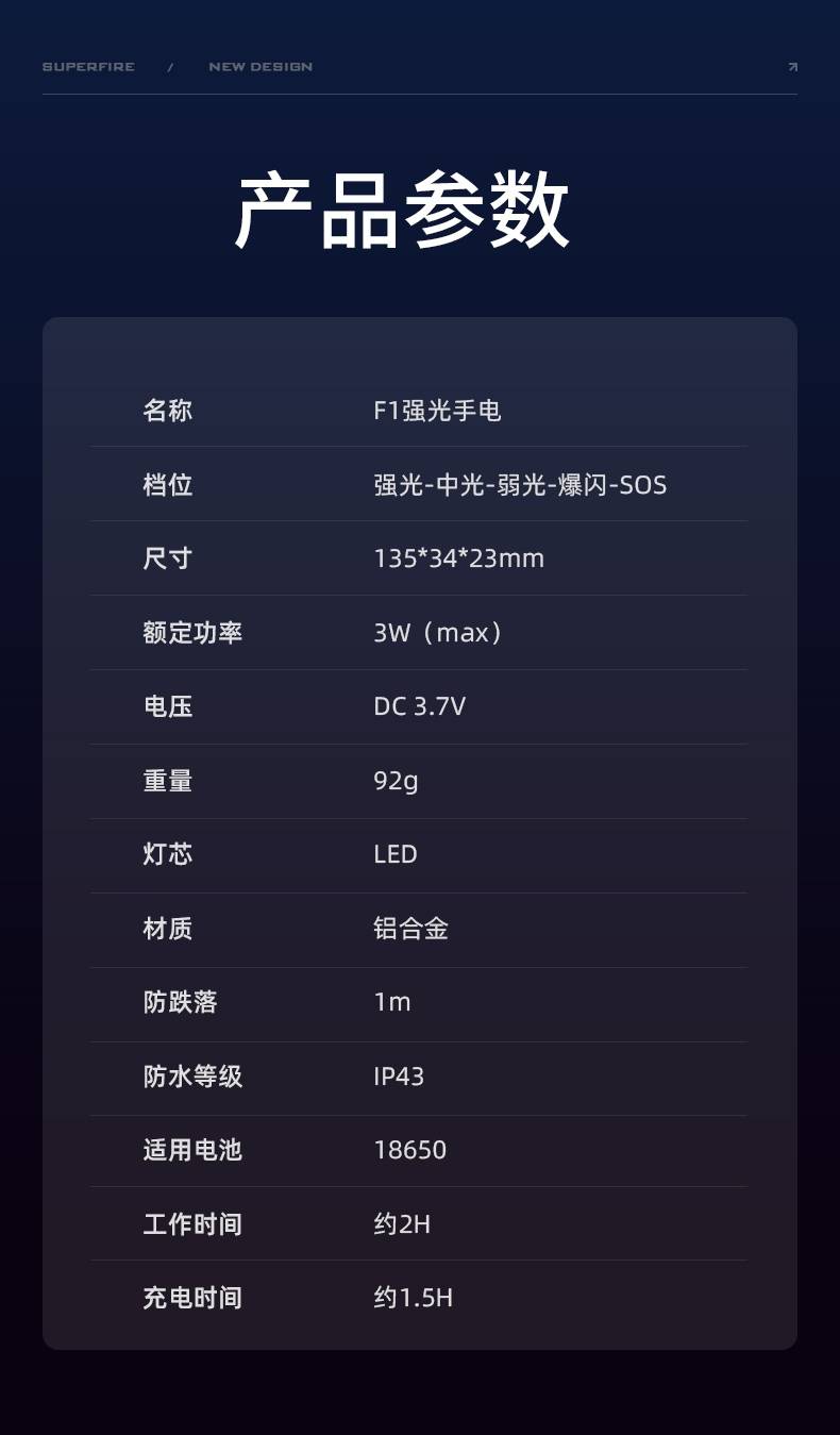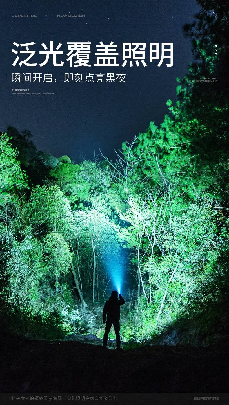 1、千米远射,射程更远,光斑更聚焦。 2、进口灯珠,亮度高,照明效果更好。 3、前后双按键,光源一键点亮,高亮瞬间开启。