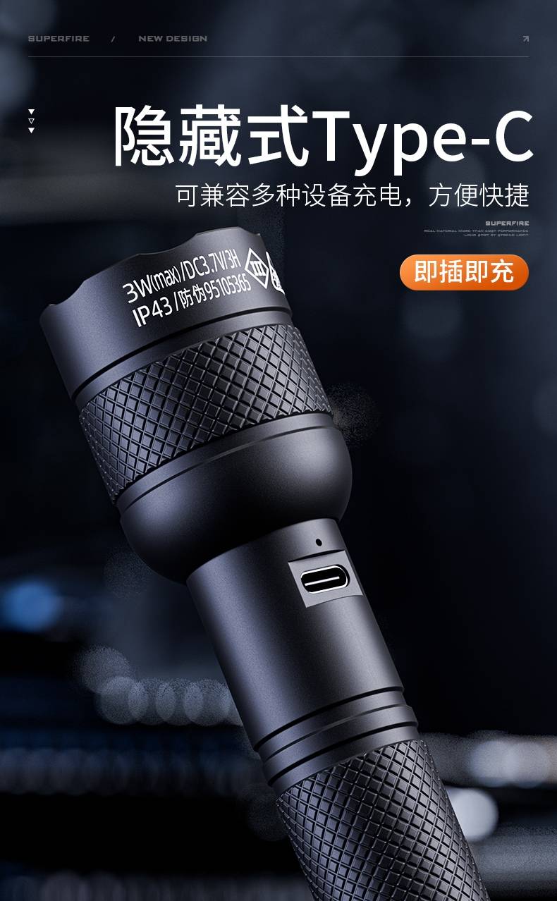 四档调光 Type-C充电 电量显示 铝合金筒身 持久续航 强力防水