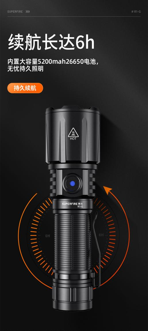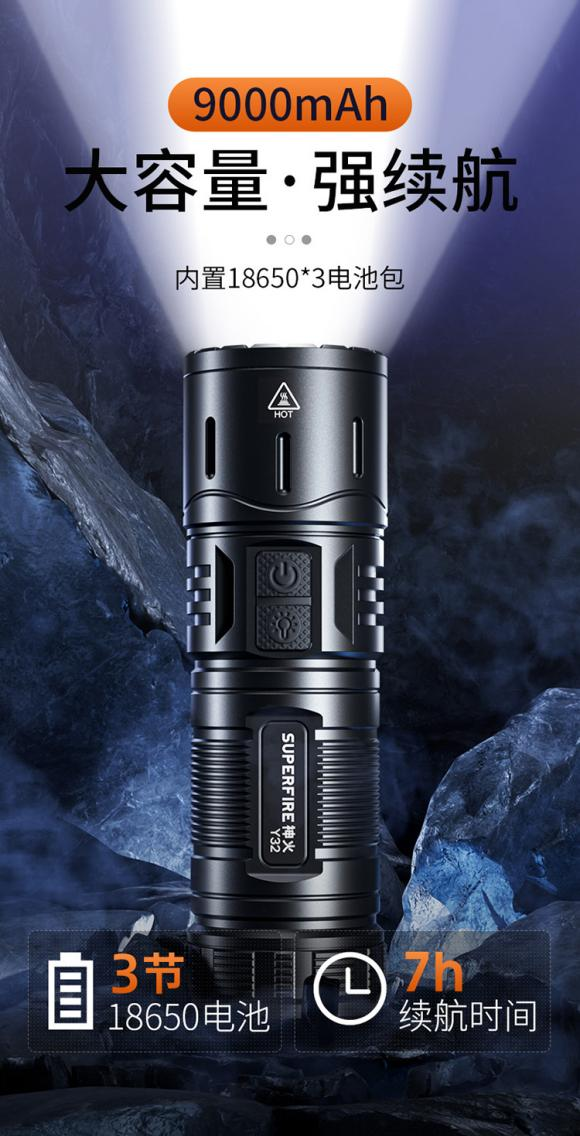 R1-G与Y32续航均分别约为6小时和7小时,支持如此强劲续航能力的便是其出色的电池容量,R1-G电池达到惊人的5200mAh,Y32也以3*3000mAh的大容量内置电池组领先大部分手电,同时,R1-G也为外置电池设计,电量不足时随时可更换电池。