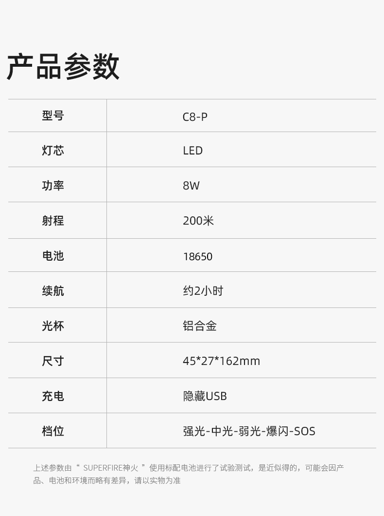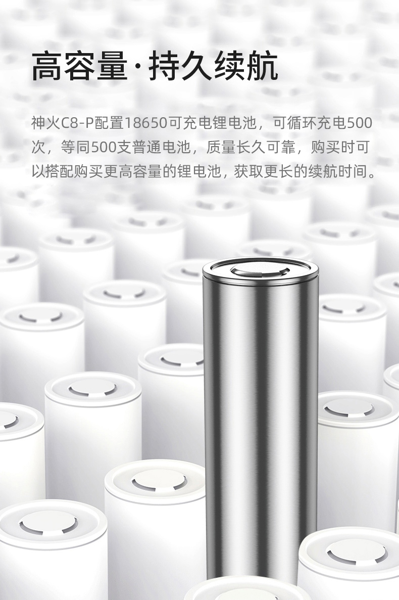 隐藏式充电口设计,科技感更强。 强光远射,亮度高射程远。充电显示,充电情况一目了然。
