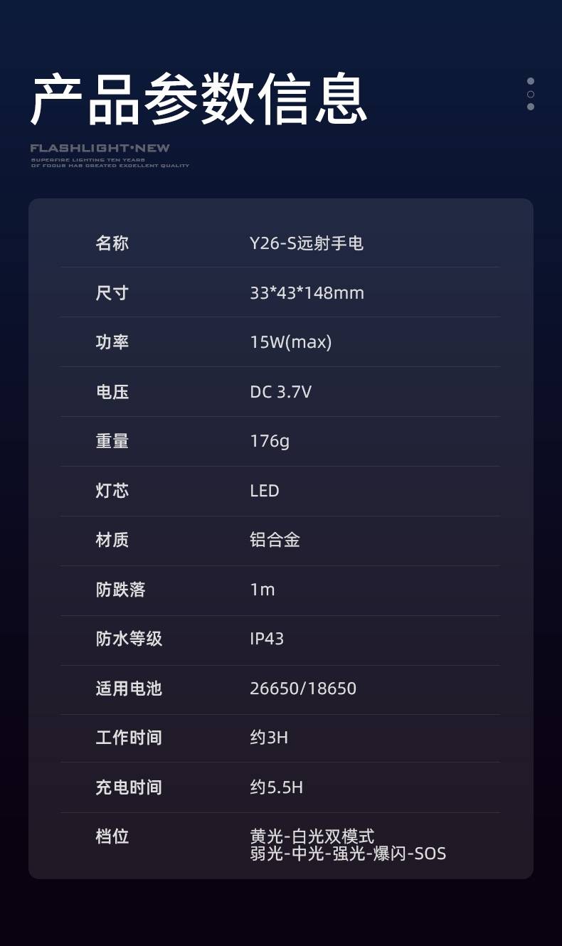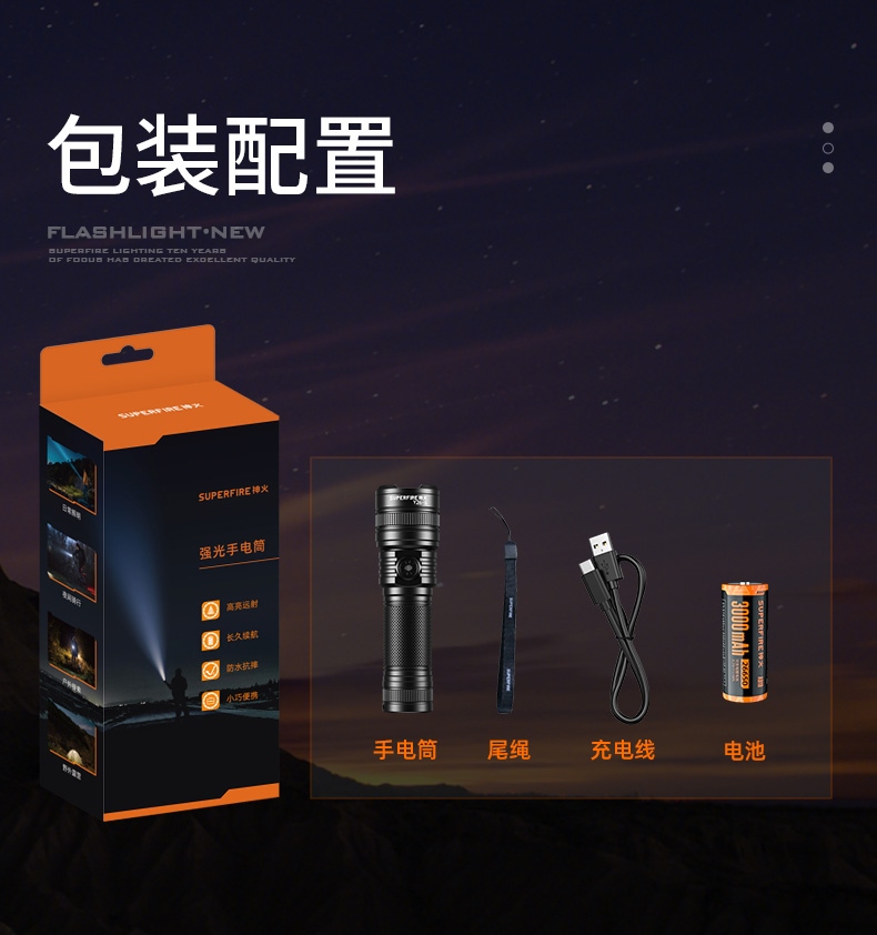 1、千米远射,射程更远,光斑更聚焦。 2、进口灯珠,亮度高,照明效果更好。 3、前后双按键,光源一键点亮,高亮瞬间开启。