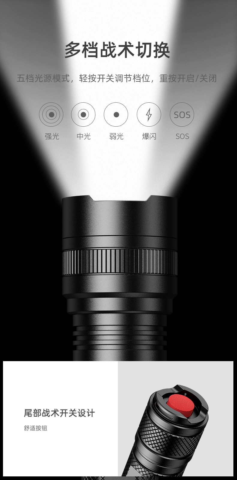 聚光主灯 亮度随心 轻按后端开关按钮,主灯强光点亮,续按依次切换主灯工作光-爆闪光。主灯开启状态下长按5秒,可实现光源色温转换。主灯关闭状态下长按5秒,可开启灯具最亮照明模式。 爆亮强光 亮如白昼 1500LM大功率高亮光源,点亮顷刻如白昼