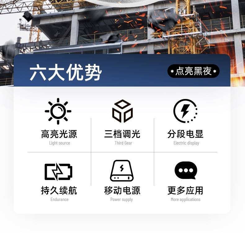 六大优势 点亮黑夜 高亮光源 持久续航 三档调光 分段电显 更多应用