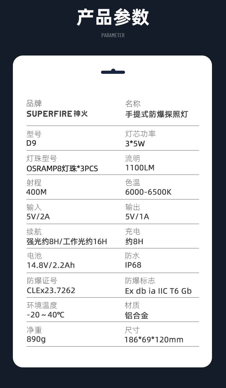 1、多档调光,可满足不同使用场景下的照明需求; 2、含提手,握感更舒适。携带更简单; 3、新型高亮远射灯珠,60W大功率,亮度高,照明效果好。